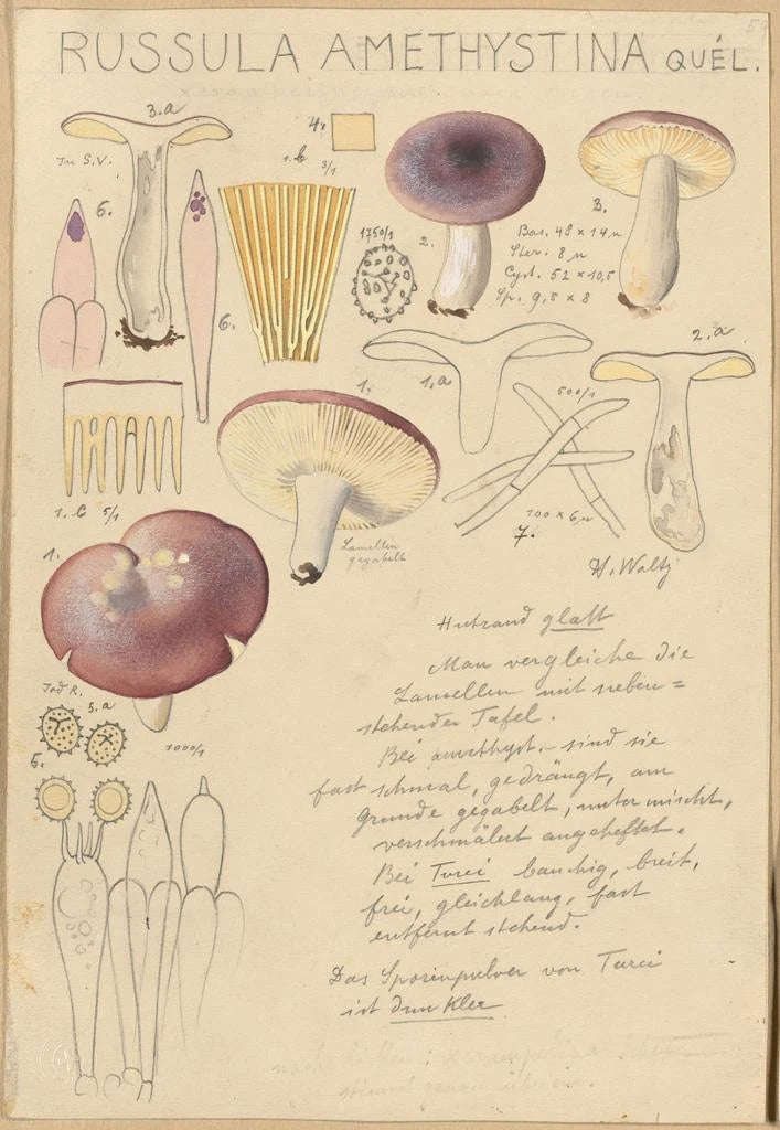 De kunstdruk van Russula amethystina dompelt ons onder in een levendige wereld waar de natuur zich uitdrukt met glans. Dit werk van Hans Baldung, uitgevoerd met een minutieuze techniek, benadrukt rijke tinten van violet en groen, die de schoonheid van paddenstoelen in hun natuurlijke habitat oproepen. De sfeer die van dit doek uitgaat, is zowel mysterieus als rustgevend, en nodigt de kijker uit om de delicate details van elk element te verkennen. De organische vormen en subtiele nuances creëren een visuele harmonie die de blik vasthoudt en de verbeelding stimuleert, waardoor dit werk een ware ode is aan biodiversiteit.