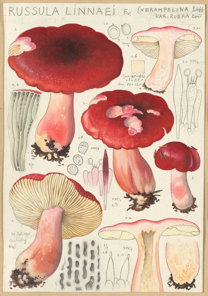 De doek van Hans Baldung die de Russula linnaei afbeeldt, is een ware ode aan de biodiversiteit. Met zijn heldere kleuren en delicate vormen vangt dit kunstwerk de essentie van deze vaak onbekende paddenstoel. De compositie is zorgvuldig in balans gebracht, waarbij de subtiele details van de Russula worden benadrukt, terwijl er een levendige en dynamische sfeer wordt gecreëerd. Het spel van licht en schaduw, typerend voor Baldung's stijl, voegt diepte toe aan het kunstwerk en nodigt de kijker uit om onder te dompelen in een wereld waarin de natuur heerst.