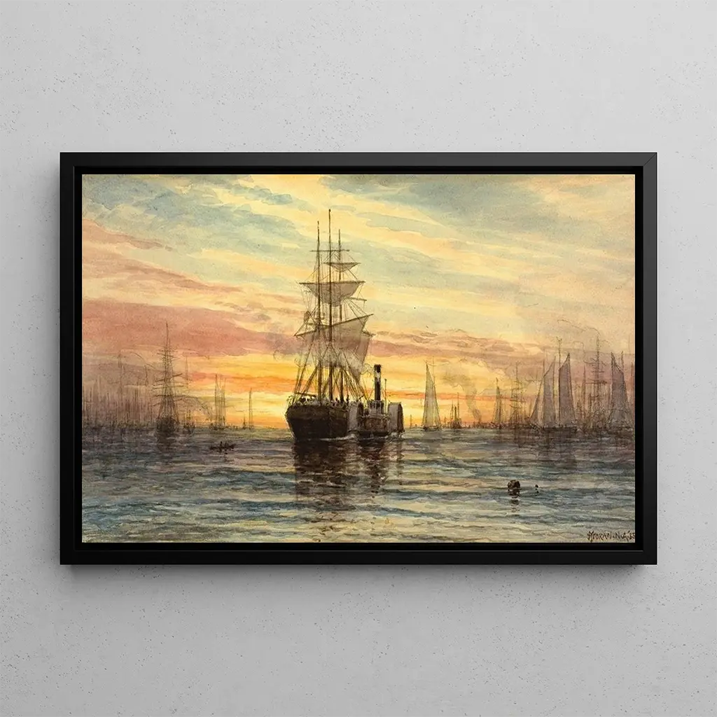 Scheepsscène: een maritieme melodie in levendige kleuren De kunstdruk Scheepsscène van Thomas Moran dompelt ons onder in een levendige en dynamische sfeer, waar de tinten blauw en groen harmonieus samensmelten om de zee en de lucht te evoceren. De witte zeilen van de boten steken af tegen de gekleurde achtergrond, waardoor een opvallend contrast ontstaat dat de aandacht trekt. Moran, meester in het spelen met licht, experimenteert met de reflecties op het water, waardoor de scène bijna levendig wordt. Elk detail, van de golven tot de silhouetten van de zeelieden, is zorgvuldig weergegeven, waardoor de kijker wordt uitgenodigd het beweging en de energie van deze levendige haven te voelen. Thomas Moran: een pionier van het Amerikaanse landschap Thomas Moran, geboren in 1837, is een iconische figuur binnen de Amerikaanse kunstbeweging van de 19e eeuw, bekend om zijn grootschalige landschappen en natuurbeschrijvingen. Geïnspireerd door Europese landschappen en de ongerepte schoonheid van de Verenigde Staten, wist hij de essentie van de plaatsen die hij schilderde vast te leggen. Moran speelde een sleutelrol in de promotie van Amerikaanse nationale parken, met name Yellowstone, door middel van zijn werken. Zijn stijl, gekenmerkt door heldere kleuren en een nauwgezette aandacht voor details, markeerde een periode waarin de Amerikaanse kunst begon te definiëren en zich te vestigen op het wereldtoneel. Een decoratief kunstdruk met vele voordelen De kunstdruk van het schilderij Scheepsscène is een ideaal decoratief stuk om je interieur te verrijken, of het nu in een woonkamer, kantoor of slaapkamer is. De hoge kwaliteit van de afdruk en de trouw aan de originele kleuren maken het een aantrekkelijke keuze voor kunstliefhebbers en liefhebbers van maritieme landschappen. Door deze doek in je inrichting te integreren, voeg je een vleugje elegantie en rust toe aan je ruimte. De esthetische aantrekkingskracht en de levendige sfeer zullen je gasten aanspreken en een warme, gastvrije ambiance creëren.