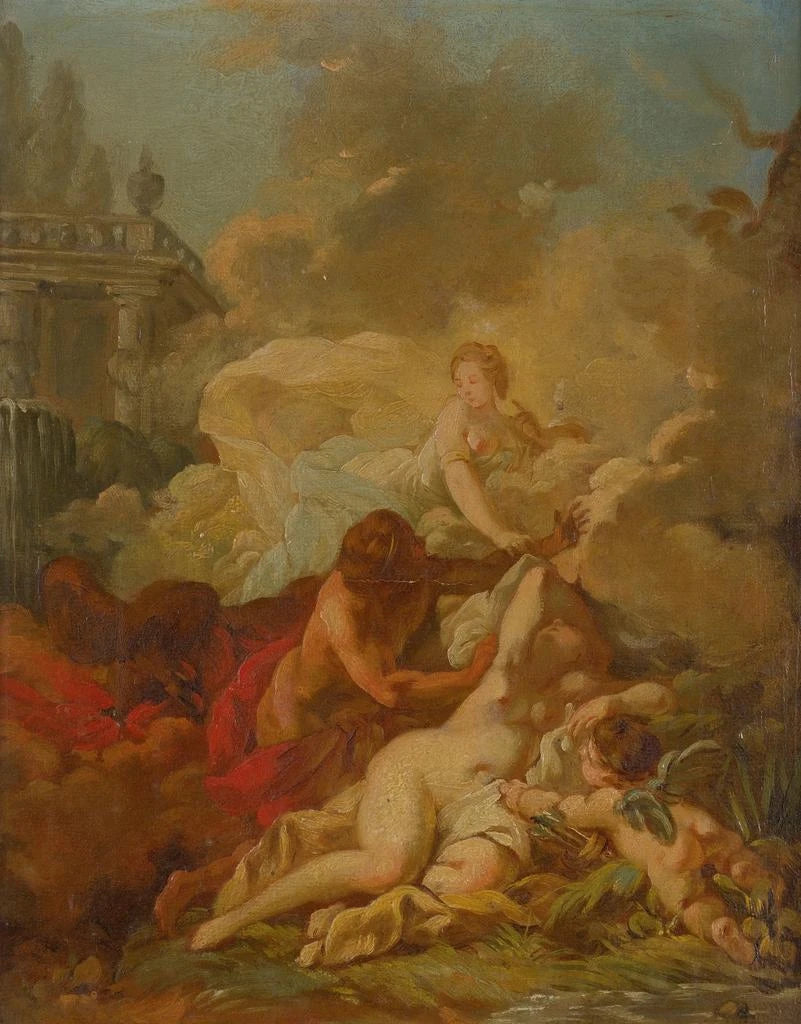 François Boucher, geboren in 1703, is een van de meest invloedrijke kunstenaars van de achttiende eeuw, en zijn werk heeft de geschiedenis van de Franse kunst gevormd. Als leerling van François Le Moyne, vestigde Boucher zich snel als de schilder aan het hof van Lodewijk XV, en werd hij de eerste schilder van de koning. Zijn stijl, vaak geassocieerd met frivoolheid en de elegantie van het aristocratische leven, wist ook de aandacht te trekken van intellectuelen en kunstliefhebbers van zijn tijd. Zijn voorstellingen van mythologie, waarin erotiek en verfijning samenkomen, hebben vele kunstenaars geïnspireerd, zowel tijdgenoten als latere generaties. De "Mythologische scène" illustreert