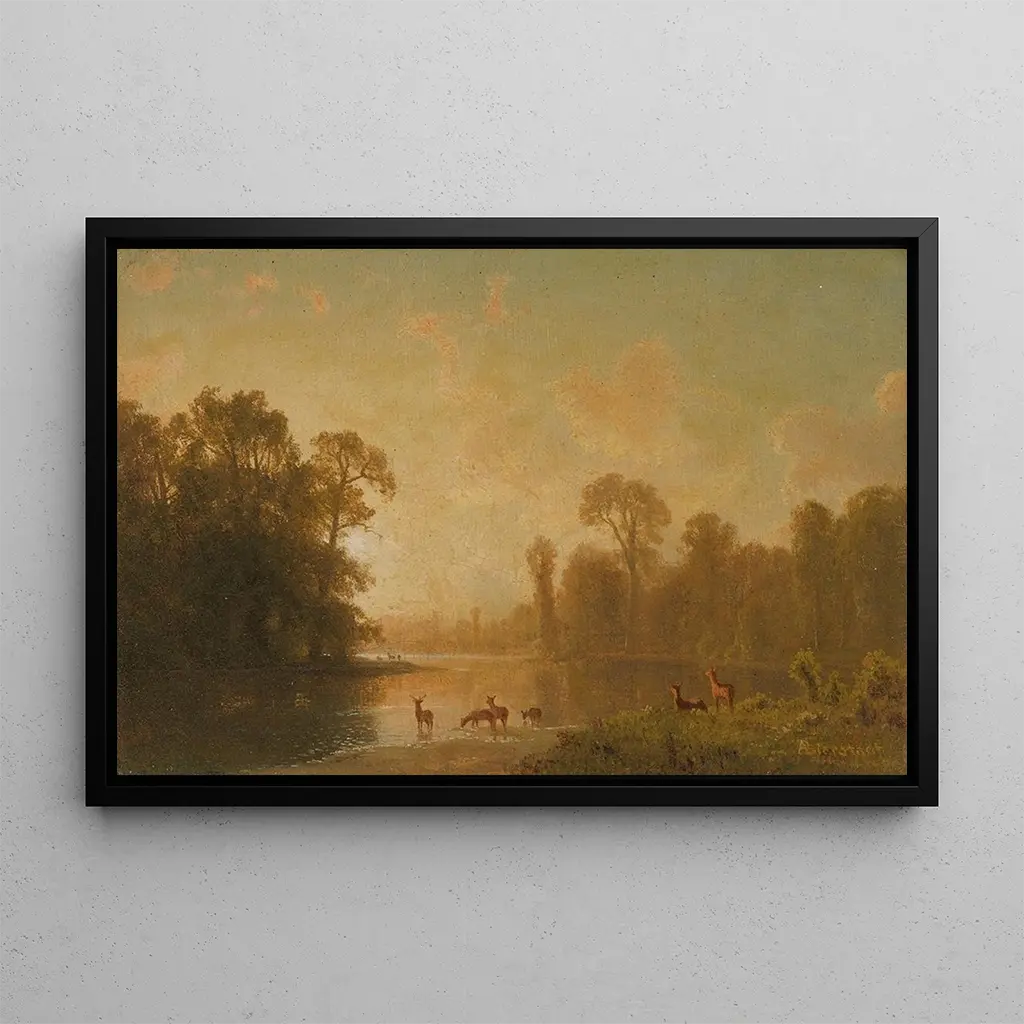Crepúsculo con ciervos: een dans tussen schaduw en licht In dit boeiende kunstwerk brengt Albert Bierstadt ons naar het hart van een majestueus landschap, waar de schemering de scène omhult met een zachte melancholie. De herten, elegante silhouetten, bewegen zich gracieus door een met goudkleurig licht doordrenkt bos. De warme kleuren en de delicate nuances van de lucht vermengen zich harmonieus met de donkerdere tinten van de bomen, waardoor een sfeer ontstaat die zowel sereen als mysterieus is. Bierstadt's techniek, gekenmerkt door een verbluffend realisme en een minutieuze aandacht voor details, nodigt ons uit om de vergankelijke schoonheid van de natuur te bewonderen. Albert Bierstadt: een pionier van het Amerikaanse landschap Albert Bierstadt, actief in de 19e eeuw, is een van de meest iconische kunstenaars van de Amerikaanse romantiek. Geïnspireerd door zijn reizen naar het Amerikaanse Westen, wist hij de grootsheid van natuurlijke landschappen vast te leggen met ongeëvenaarde precisie en poëzie. Zijn werken, vaak geïnspireerd door de ongerepte natuur, getuigen van een tijd waarin de verovering van het Westen in volle gang was. Bierstadt speelde een cruciale rol in de popularisering van Amerikaanse landschappen, en zijn onderscheidende stijl, die realisme en romantiek combineert, blijft hedendaagse kunstenaars beïnvloeden. Een decoratief stuk met vele voordelen De kunstdruk van "Crepúsculo con ciervos" is een decoratief stuk dat elk interieur kan verrijken, of het nu in een woonkamer, kantoor of slaapkamer is. De hoge kwaliteit van de afdruk en de esthetische aantrekkingskracht maken het een ideale keuze voor wie een vleugje natuur en sereniteit in hun ruimte wil brengen. Dit schilderij, met zijn delicate nuances en rustgevende sfeer, nodigt uit tot dromen en contemplatie, terwijl het harmonieus past in diverse decoratiestijlen. Gun jezelf deze doek en laat je betoveren door de magie van de schemering.