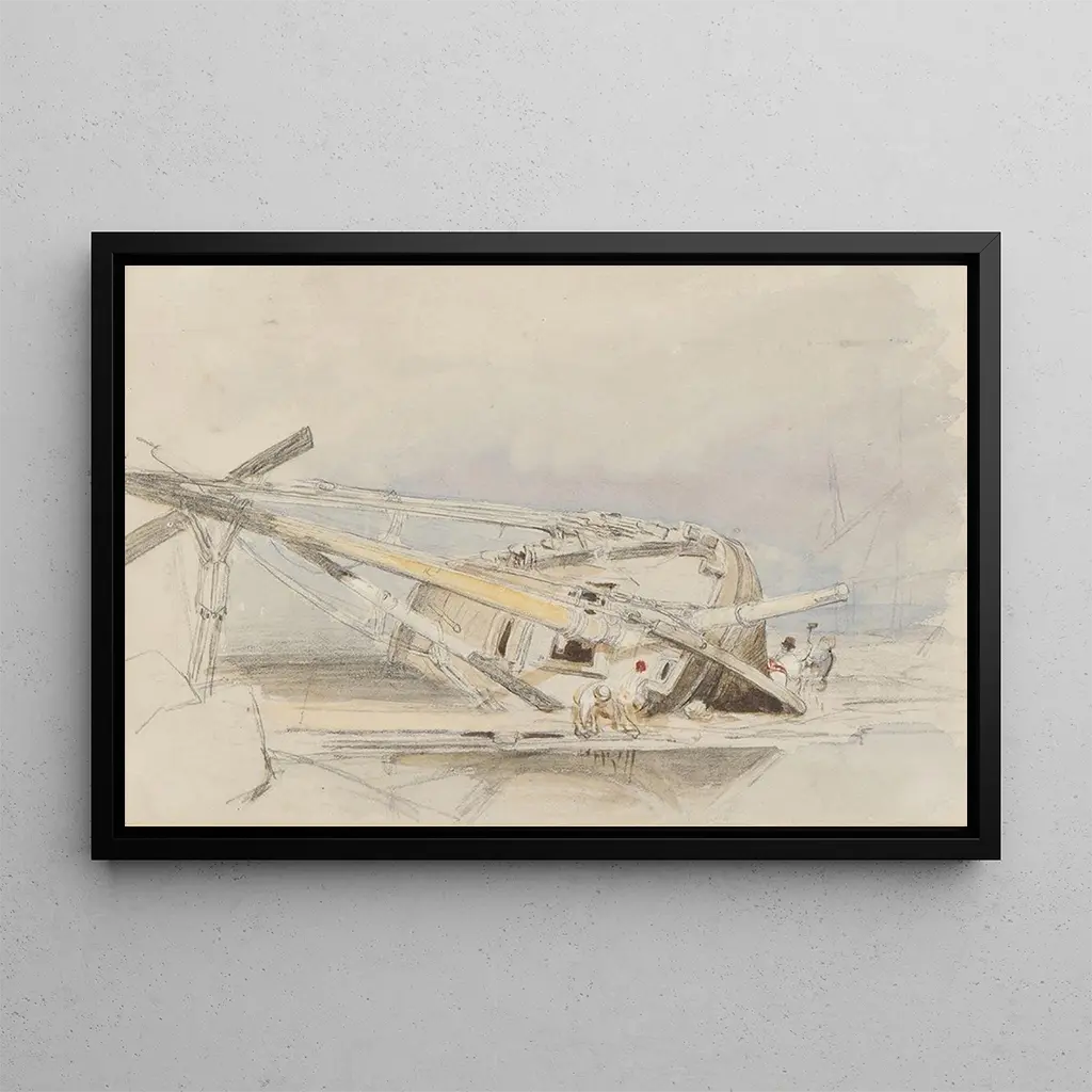 Clarkson Stanfield, actief in de 19e eeuw, wordt erkend om zijn maritieme voorstellingen die de schoonheid en de gevaarlijkheid van de zee vastleggen. Geïnspireerd door de romantische beweging, wist hij precisie en emotionele gevoeligheid te combineren. Zijn werk valt binnen een periode waarin landschapsschilderkunst een opleving doormaakte, en hij onderscheidt zich door zijn vermogen om dramatische sferen over te brengen. Stanfield was ook een toneelschilder, wat zijn visuele aanpak heeft verrijkt. Zijn werken, waaronder "Vlot gestrandet", getuigen van het belang van de zee in de collectieve verbeelding van zijn tijd.