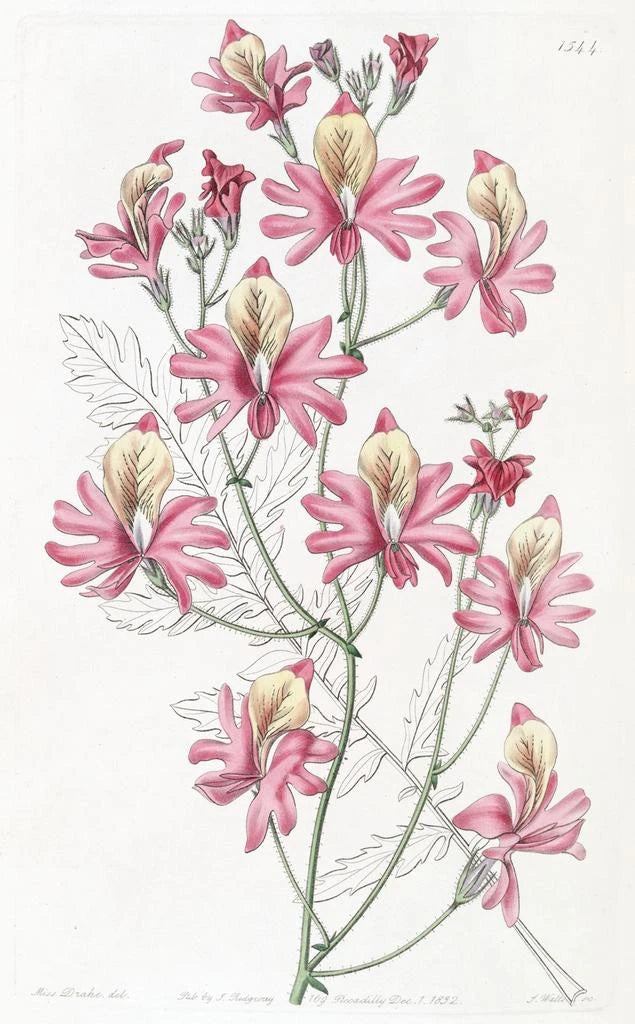 Le Schizanthus à pétales émoussés, œuvre de Sydenham Edwards, évoque un jardin secret où la nature s’épanouit dans toute sa splendeur. Les teintes pastel, allant du rose tendre au violet délicat, se mêlent harmonieusement pour créer une atmosphère douce et apaisante. La technique de la lithographie, utilisée par Edwards, permet de rendre chaque détail des fleurs avec une précision remarquable, capturant la légèreté et la grâce de ces plantes. L'œuvre invite à une contemplation attentive, où chaque pétale semble vibrer sous la caresse d'une brise légère, offrant une véritable ode à la beauté éphémère de la nature.