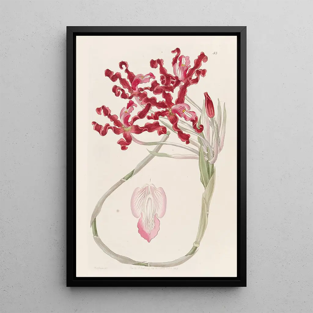 De kunstdruk van de Schomburgkia ondulée, werk van Sydenham Edwards, dompelt ons onder in een botanisch universum waar de verfijning van de bloemblaadjes samengaat met de kracht van de stelen. De levendige kleuren, variërend van diep paars tot stralend wit, creëren een opvallend contrast dat de aandacht trekt. De graveertechniek die Edwards gebruikt, geeft elk detail een opmerkelijke precisie en eert de natuurlijke schoonheid van deze orchidee. De sfeer die van dit doek uitgaat, roept een rustgevende sereniteit op en nodigt uit tot verwondering over de pracht van de natuur.