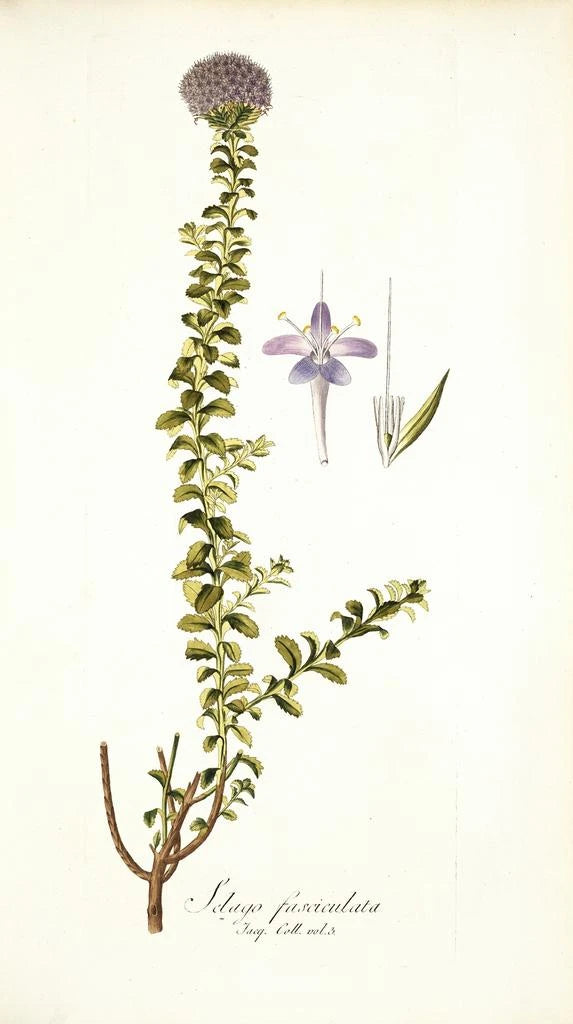 Nikolaus Joseph Freiherr von Jacquin, een iconische figuur uit de achttiende eeuw, wist kunst en wetenschap te combineren door middel van zijn botanische illustraties. Zijn werk werd beïnvloed door de wetenschappelijke ontdekkingen van zijn tijd, waardoor hij in staat was om weinig bekende plantensoorten te ontdekken en te vertegenwoordigen. Selago fasciculata is een van zijn vele werken die getuigen van zijn talent en toewijding aan de botanica. Als pionier op het gebied van wetenschappelijke illustratie, heeft Jacquin de weg geëffend voor een beter begrip van planten, terwijl hij hun intrinsieke schoonheid vierde.