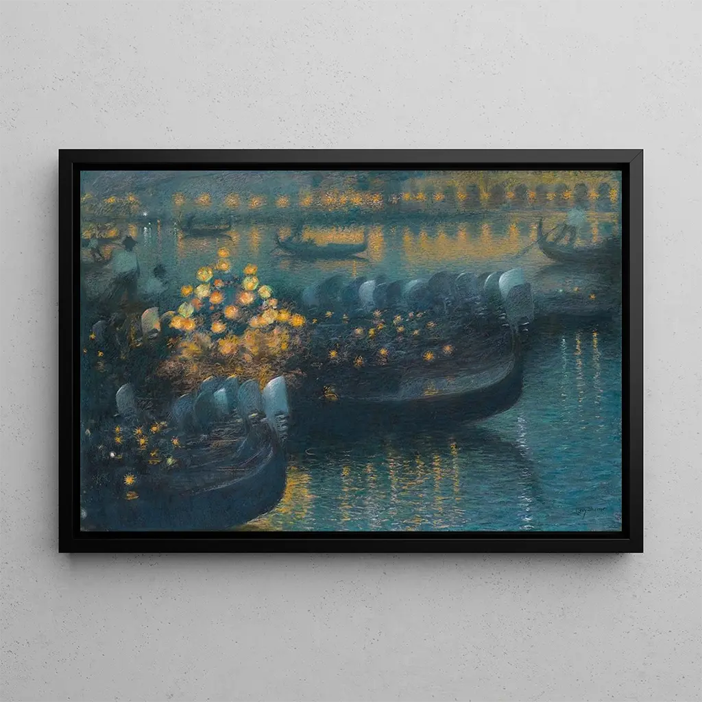 Serenade bij maanlicht in Venetië: een visuele melodie onder de sterren In deze kunstdruk van "Serenade bij maanlicht in Venetië" brengt Lucien Lévy-Dhurmer ons in een romantische en poëtische sfeer. Het doek, badend in zacht, zilverachtig licht, roept de magie van de Venetiaanse nachten op. De reflecties op het water, de silhouetten van de gondels en de historische gebouwen creëren een harmonieuze compositie. De kleuren, variërend van diepe blauwen tot zilveren nuances, voegen een dromerige dimensie toe aan het werk. Lévy-Dhurmer's techniek, die impressionisme en symbolisme combineert, brengt deze nachtelijke scène tot leven en nodigt de kijker uit zich onder te dompelen in deze kunstdruk. Lucien Lévy-Dhurmer: een meester van het symbolisme en impressionisme Lucien Lévy-Dhurmer, actief aan het einde van de 19e en het begin van de 20e eeuw, is een Franse kunstenaar die erkend wordt om zijn werken die de schoonheid van landschappen en intieme scènes vastleggen. Geïnspireerd door de symbolistische beweging, wist hij een verfijnde techniek te combineren met een poëtisch gevoel. Zijn werk onderscheidt zich door het gebruik van delicate kleuren en lichtspelingen, kenmerkend voor het impressionisme. Lévy-Dhurmer was ook een fervent voorstander van de schoonheid van de natuur, wat duidelijk wordt in zijn werken. "Serenade bij maanlicht in Venetië" is een perfect voorbeeld van zijn talent om emoties op te roepen door betoverende landschappen. Een decoratief stuk met vele voordelen Deze kunstdruk van "Serenade bij maanlicht in Venetië" is een ideaal decoratief stuk om je interieur te verrijken. Of het nu in een woonkamer, kantoor of slaapkamer is, het brengt een vleugje romantiek en elegantie in je inrichting. De kwaliteit van de afdruk garandeert een nauwkeurige weergave van de details van het originele werk, zodat je volop kunt genieten van de magie van de scène. Met zijn onmiskenbare esthetische aantrekkingskracht zal deze doek je gasten aanspreken en een rustgevende en inspirerende sfeer creëren in je leefruimte.