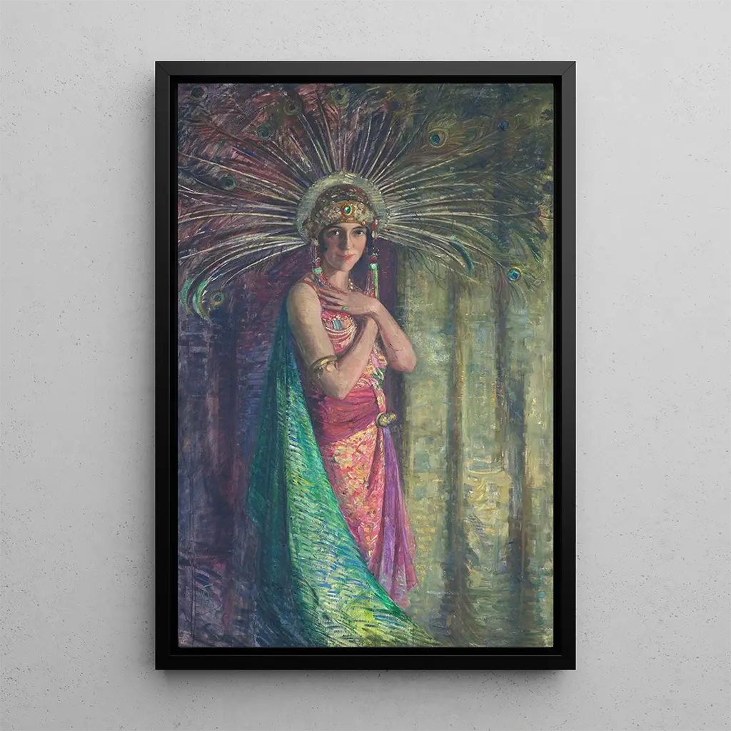 De kunstdruk van Sheba, een werk van Mary Elizabeth Tripe, dompelt ons onder in een wereld waar schoonheid en elegantie samenkomen. Dit schilderij, rijk aan details, benadrukt een vrouw met een opmerkelijke gratie, omgeven door een sfeer van mysterie en sereniteit. De warme kleuren en de delicate nuances van de huid contrasteren met de donkere elementen op de achtergrond, waardoor een indrukwekkende diepte ontstaat. De fotografische techniek van Tripe, die schilderkunst en fotografie combineert, biedt een unieke textuur die de blik trekt en uitnodigt tot contemplatie. Elk element van de compositie lijkt een verhaal te vertellen, dat van een vrouw die zowel sterk als kwetsbaar is.