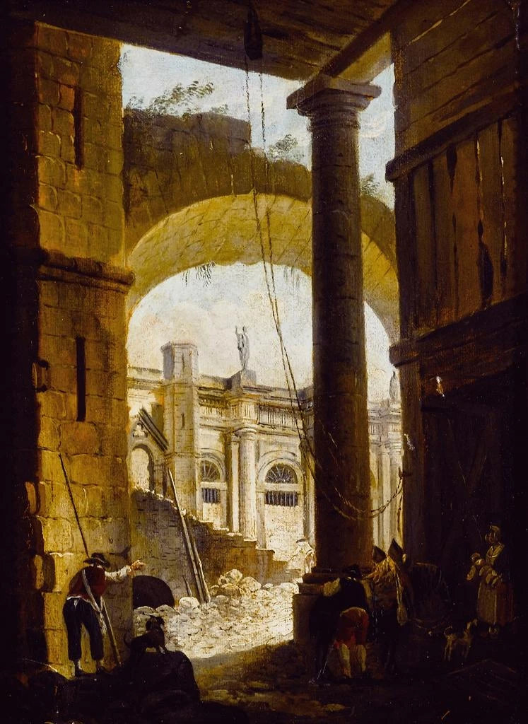 Dans Démolition d'un édifice composite, Pierre-Antoine Demachy nous plonge au cœur d'une scène de transition, où l'ancien laisse place au nouveau. Les couleurs terreuses et les nuances de gris évoquent la mélancolie d'un passé révolu, tandis que les détails architecturaux sont rendus avec une précision remarquable. La technique de Demachy, qui mêle aquarelle et dessin, confère à cette œuvre une atmosphère à la fois dynamique et contemplative. Ce tableau, à la fois documentaire et artistique, invite à réfléchir sur l'évolution des paysages urbains et sur la fragilité des constructions humaines.