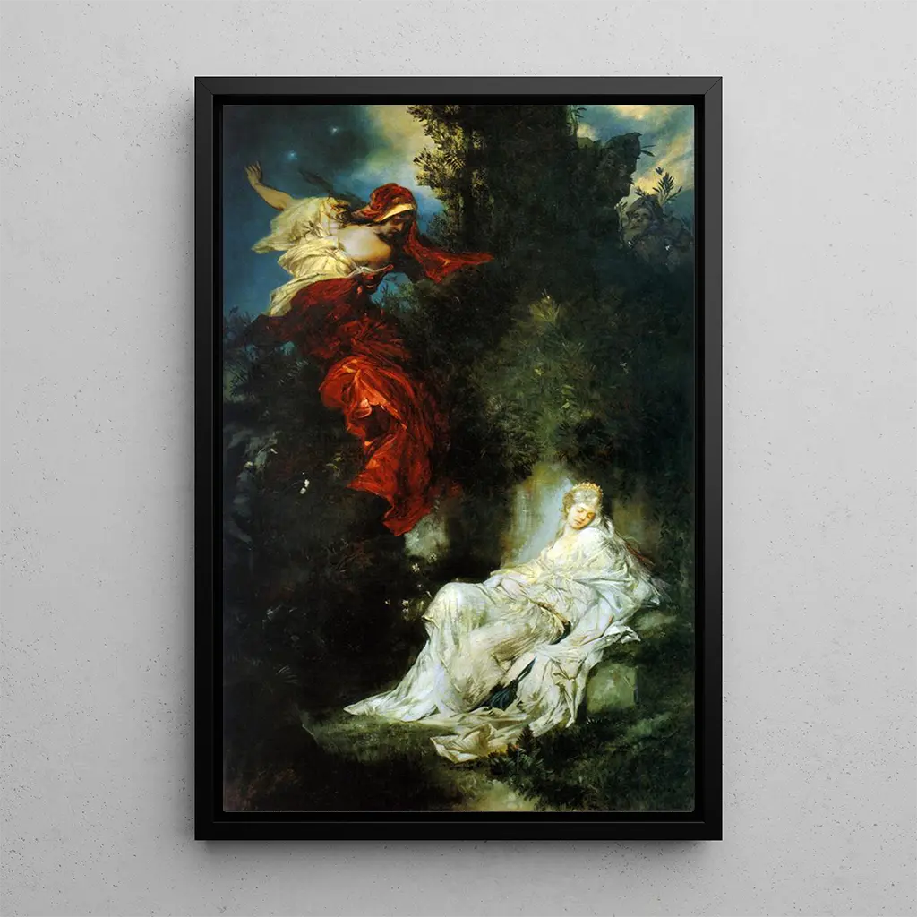 Blanche-Neige endormie : een kunstdruk die een droom in de tijd vasthoudt In "Blanche-Neige endormie" vangt Hans Makart de essentie van het sprookje met poëtische subtiliteit. De scène, doordrenkt met zachte en rustgevende tinten, roept een moment van sereniteit en kwetsbaarheid op. De minutieuze details van het gezicht van Blanche-Neige, evenals de omliggende bloemrijke elementen, creëren een dromerige en magische sfeer. Makart's techniek, die realisme en romantiek combineert, laat de diepte van emoties voelen en nodigt de kijker uit om deze iconische afbeelding van schoonheid en onschuld te bewonderen. Hans Makart : een virtuoos van het narratieve kunst Hans Makart, geboren in 1840 in Wenen, is een opvallende figuur binnen de Oostenrijkse kunstbeweging van de 19e eeuw. Zijn werk wordt gekenmerkt door een rijke kleurenpalet en krachtige visuele vertellingen, beïnvloed door romantiek en barok. Makart wist mythologische verhalen en legendes met een zeldzame intensiteit vast te leggen, waardoor hij een onmisbare kunstenaar van zijn tijd werd. Zijn flamboyante stijl en dynamische composities hebben een blijvende indruk achtergelaten in de kunstwereld, en inspireren nog steeds vele kunstenaars en kunstliefhebbers. Een decoratieve kunstdruk met vele voordelen De kunstdruk van "Blanche-Neige endormie" is een perfecte keuze om uw woonruimte te verfraaien. Of het nu in een woonkamer, slaapkamer of kantoor is, dit doek brengt een vleugje magie en verfijning in uw decoratie. De kwaliteit van de kunstdruk garandeert een nauwkeurige weergave van de details en kleuren, waardoor de essentie van het originele werk behouden blijft. Door dit schilderij in uw interieur te integreren, creëert u een gastvrije en inspirerende omgeving, terwijl u het artistieke erfgoed van een meester uit de 19e eeuw viert.
