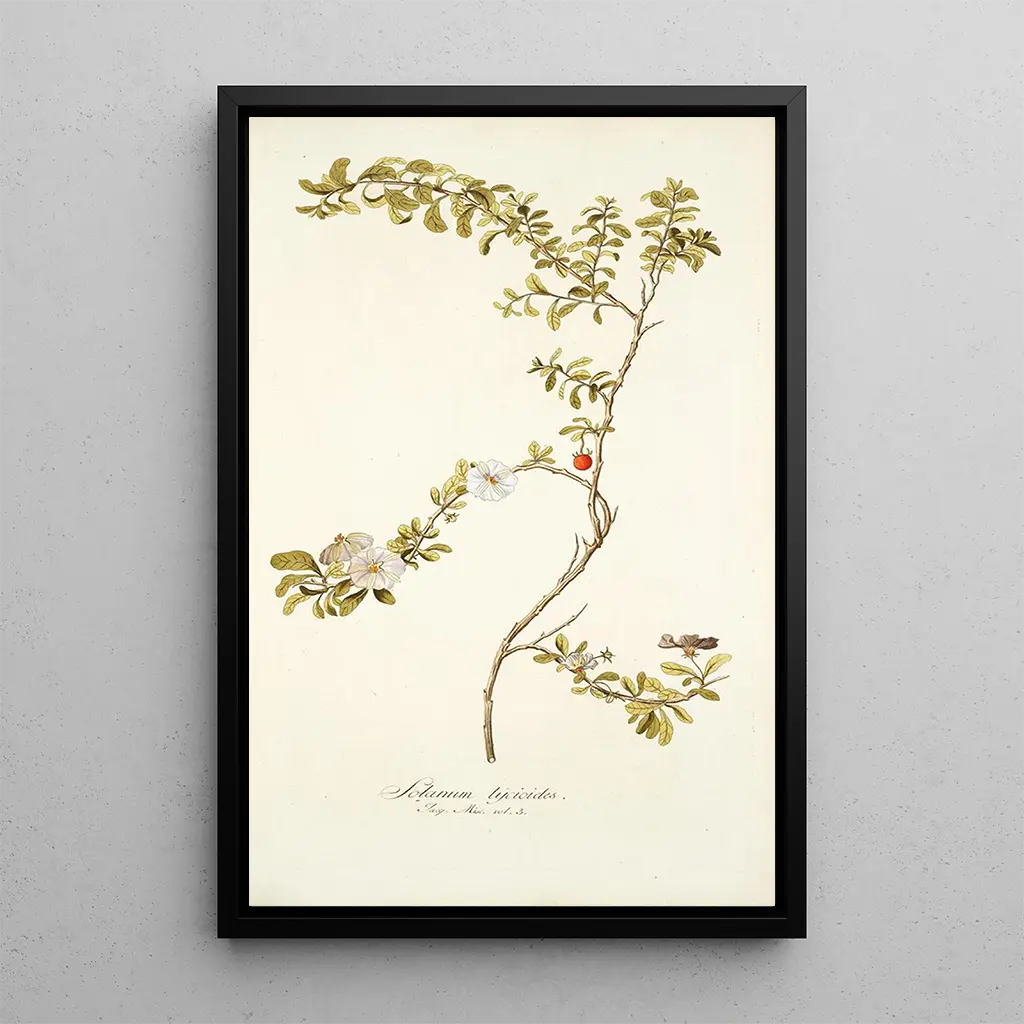 De kunstdruk van Solanum lycioides vormt een ideaal decoratief stuk om je interieur te verrijken. Of het nu in een woonkamer, kantoor of slaapkamer is, dit schilderij brengt een vleugje frisheid en elegantie. De kwaliteit van de afdruk garandeert een trouwheid aan de kleuren en details van het originele werk, waardoor je de schoonheid van deze plant volledig kunt waarderen. De esthetische aantrekkingskracht van dit doek maakt het een perfecte keuze voor wie kunst en natuur wil combineren in hun decoratie, en tegelijkertijd een vleugje verfijning aan hun leefruimte wil toevoegen.