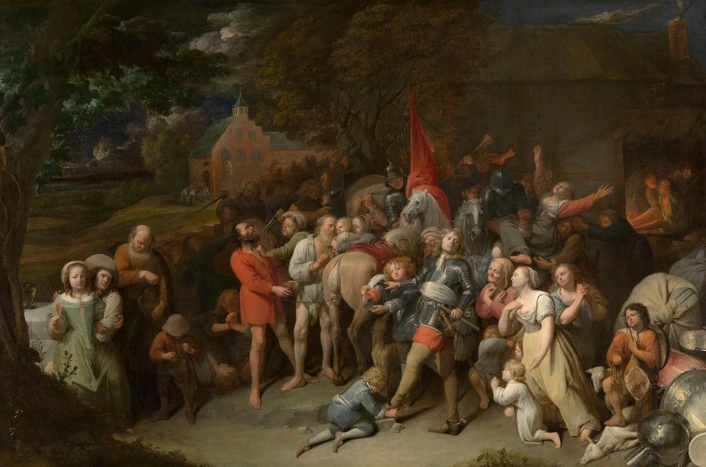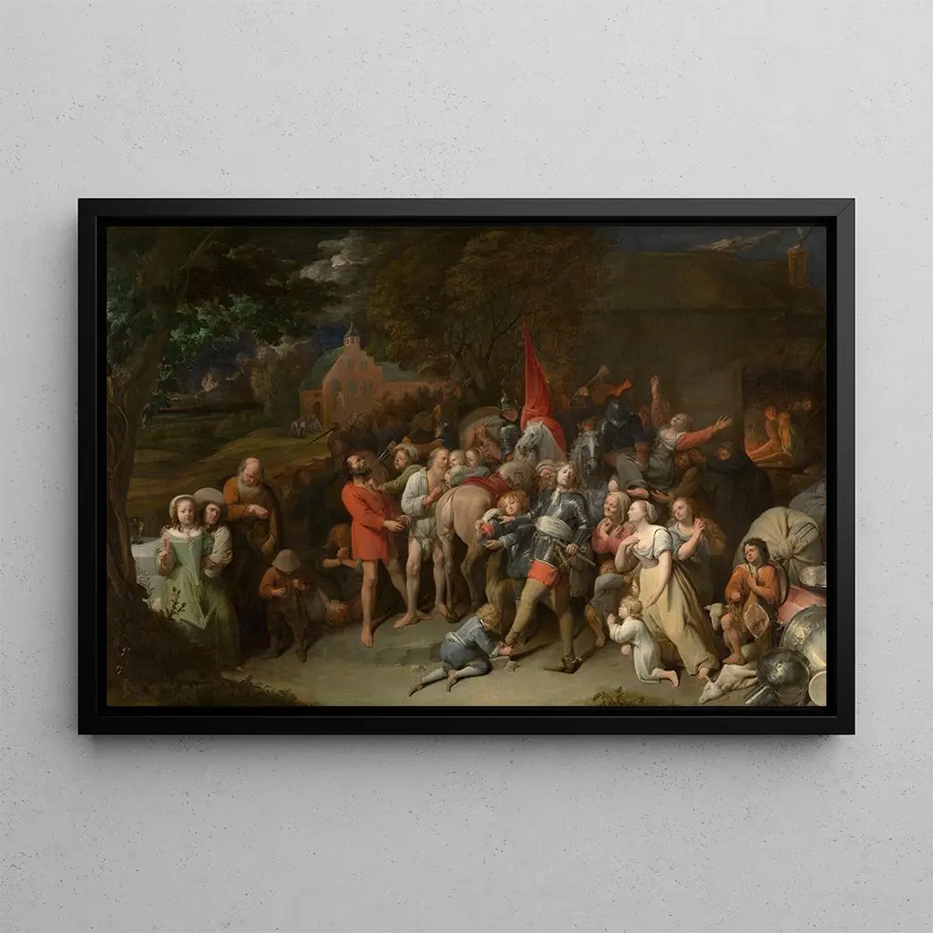 Soldatenplunderaars: een scène vol spanning en drama In "Soldatenplunderaars" schetst David Ryckaert III een indrukwekkende scène waarin de dramatische intensiteit voelbaar is. De donkere, aardse kleuren domineren de compositie en versterken het gevoel van chaos en wanhoop. De personages, vastgelegd in expressieve houdingen, brengen een rauwe emotie over die de aandacht van de kijker trekt. Ryckaerts techniek, gekenmerkt door een minutieuze realisme, laat de spanning van deze confrontatie voelen, terwijl de details van de wapens en kleding van de soldaten een historische diepte aan het werk toevoegen. Dit schilderij is een ware uitnodiging om na te denken over de gevolgen van oorlog en geweld. David Ryckaert III: een getuige van de tumulten van zijn tijd David Ryckaert III, Vlaamse schilder uit de 17e eeuw, staat bekend om zijn werken die de thema's oorlog en menselijke ellende verkennen. Opgegroeid in een rijke artistieke context, werd hij beïnvloed door de meesters van de Vlaamse schilderkunst, terwijl hij zijn eigen stijl ontwikkelde. Zijn werken, vaak doordrenkt met sociale kritiek, weerspiegelen de spanningen van zijn tijd, gekenmerkt door voortdurende conflicten. Ryckaert slaagde erin de essentie van de menselijke conditie vast te leggen door zijn schilderijen, waardoor hij een onmisbare kunstenaar van zijn tijd is geworden, wiens impact nog steeds voelbaar is. Een decoratieve aankoop met vele voordelen De kunstdruk van het schilderij "Soldatenplunderaars" is een gedurfde keuze voor iedereen die zijn interieur wil verrijken met een werk vol geschiedenis en emotie. Of het nu in een woonkamer, kantoor of slaapkamer is, dit doek trekt de aandacht en stimuleert gesprekken. De afdrukkwaliteit garandeert een opmerkelijke fideliteit aan de details van het originele werk, waardoor je de kracht van de scène volledig kunt ervaren. Door dit stuk in je decoratie te integreren, breng je niet alleen een artistiek accent aan, maar ook een reflectie op de kwesties van oorlog en vrede, waardoor je ruimte zowel esthetisch als betekenisvol wordt.