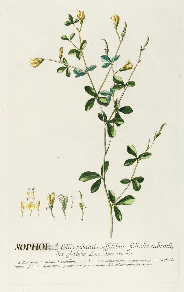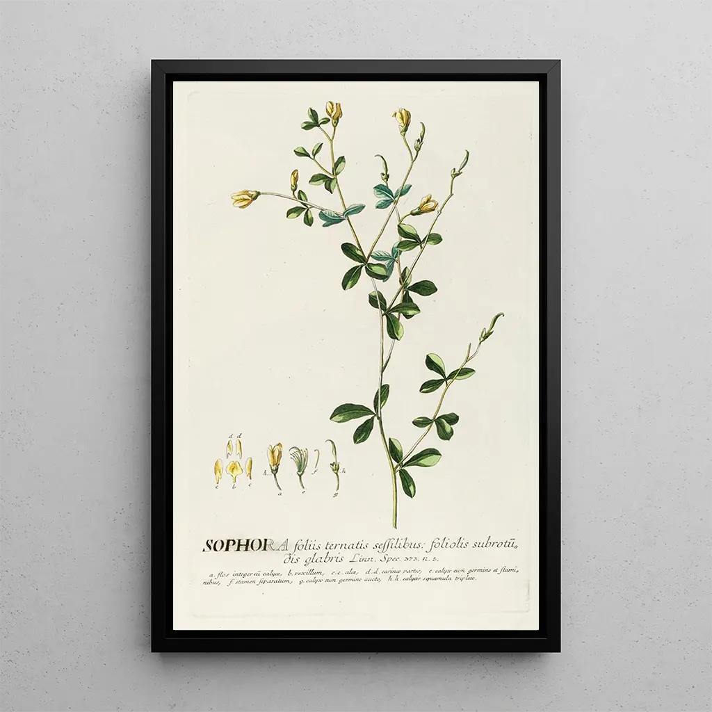 Georg Dionysius Ehret, actief in de achttiende eeuw, wordt erkend als een van de grootste botanische kunstenaars van zijn tijd. Zijn passie voor de natuur en zijn verlangen om de flora te documenteren, hebben hem geleid tot het maken van werken met ongeëvenaarde wetenschappelijke precisie. Geïnspireerd door de botanische ontdekkingen van zijn tijd, wist Ehret kunst en wetenschap te combineren, waardoor een nieuw genre ontstond dat de geschiedenis van de kunst heeft beïnvloed. Zijn werken, waaronder "Sophora II", getuigen van zijn inzet voor een getrouwe weergave van planten, terwijl ze doordrenkt zijn met artistieke gevoeligheid die ze tijdloos maakt.