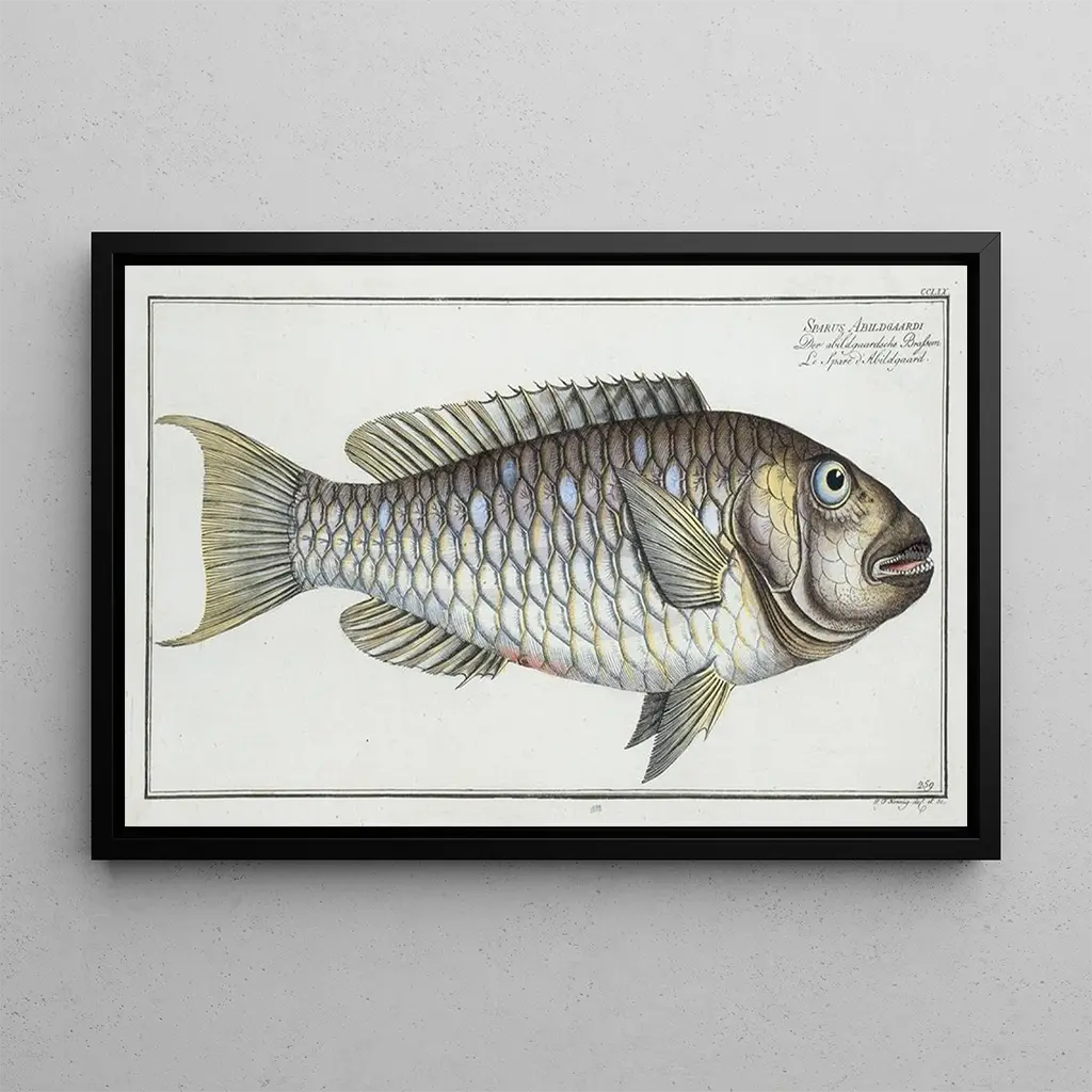De kunstdruk Sparus Abildgaardi van Marcus Elieser Bloch onthult een fascinerende onderwaterwereld, waar de schoonheid van de vissen samengaat met de rijkdom van de kleuren. Dit schilderij, dat een sparidé voorstelt, is een ware ode aan de mariene biodiversiteit. De minutieuze details en de delicate nuances van blauw en goud eren de fijnheid van de natuur. Het werk, zowel wetenschappelijk als artistiek, roept nieuwsgierigheid op naar de waterwereld en moedigt aan tot het verkennen en ontdekken van de verborgen wonderen onder de golven.