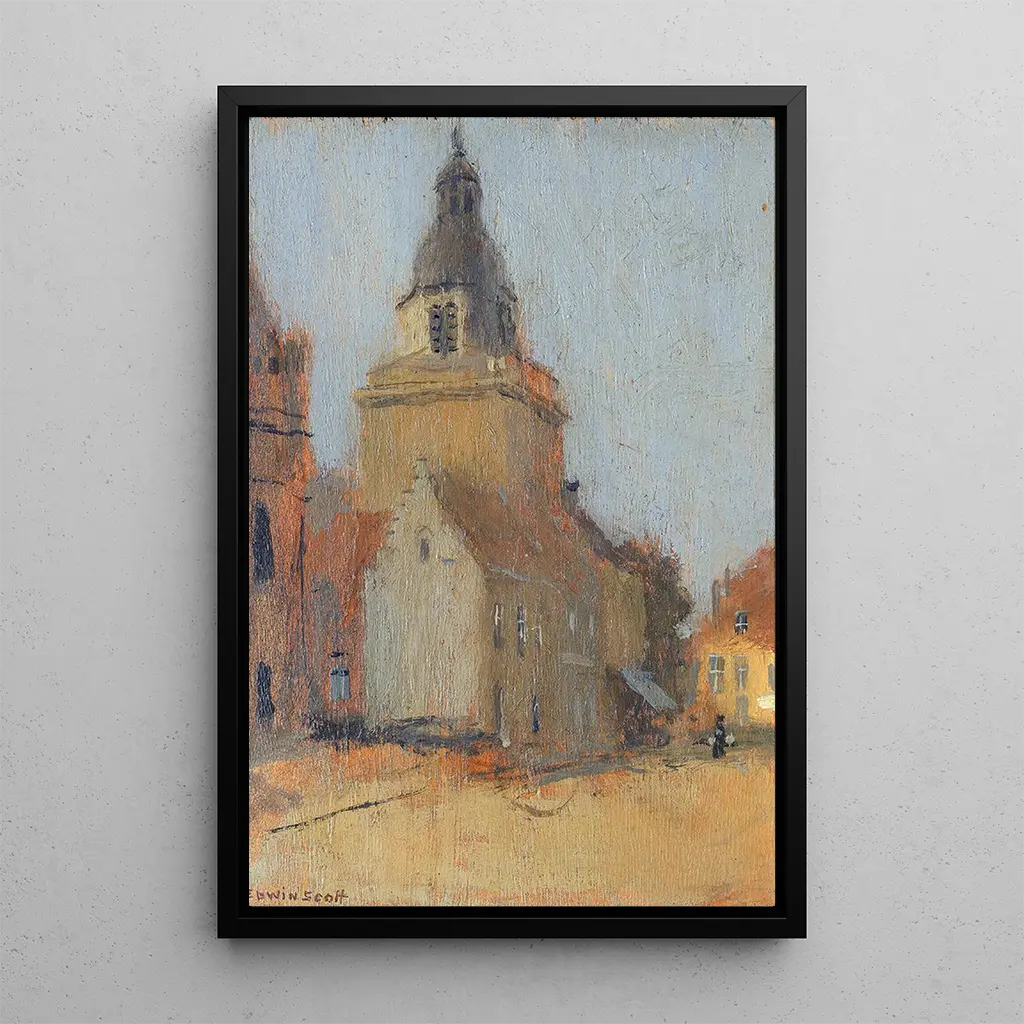 De kunstdruk Église de Ville van Frank Edwin Scott dompelt ons onder in een wereld waar heilige architectuur samengaat met de schoonheid van het landschap. Dit doek, rijk aan details, toont een majestueuze kerk, omgeven door een weelderige natuur. De levendige en heldere kleuren, gecombineerd met delicate schaduwen, creëren een rustige en contemplatieve sfeer. Scott beheerst perfect de techniek van olieverf, waardoor de texturen van de stenen en het lichtspel op de gevel van de kerk nauwkeurig kunnen worden weergegeven. Dit werk nodigt uit tot reflectie en meditatie, terwijl het de schoonheid van religieuze architectuur viert.