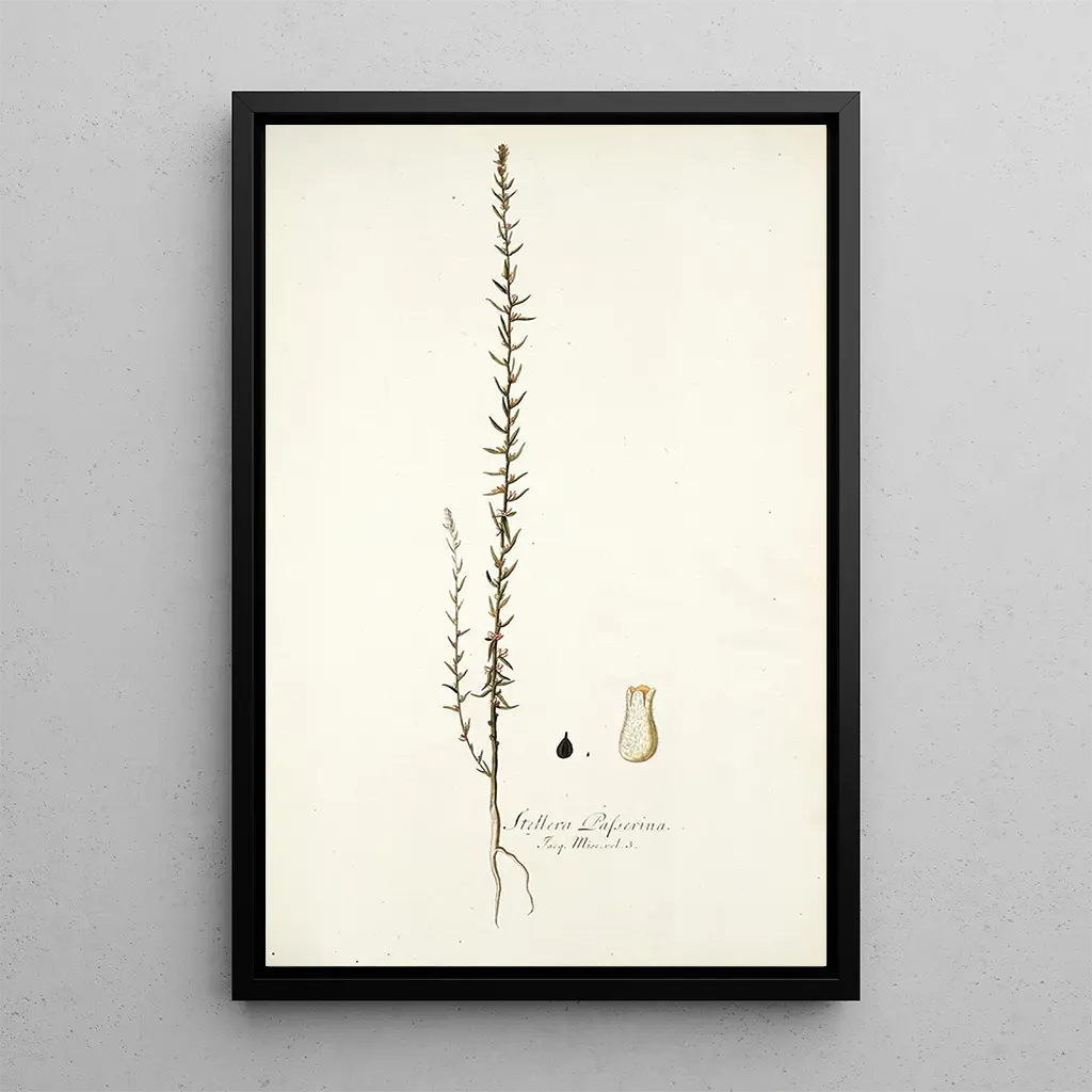 De kunstdruk van Stellera passerina, een werk van Nikolaus Joseph Freiherr von Jacquin, dompelt ons onder in een wereld van natuurlijke schoonheid. Dit doek, rijk aan details, vangt de essentie van de plant met opmerkelijke precisie. De pastelkleuren, variërend van zacht roze tot delicate groen, creëren een rustgevende en contemplatieve sfeer. De aquareltechniek, vakkundig toegepast, benadrukt de subtiele nuances van de bloemblaadjes en bladeren, terwijl het geheel diepte krijgt. Het werk nodigt uit tot nauwkeurig observeren, en onthult de complexiteit en verfijning van de natuur.