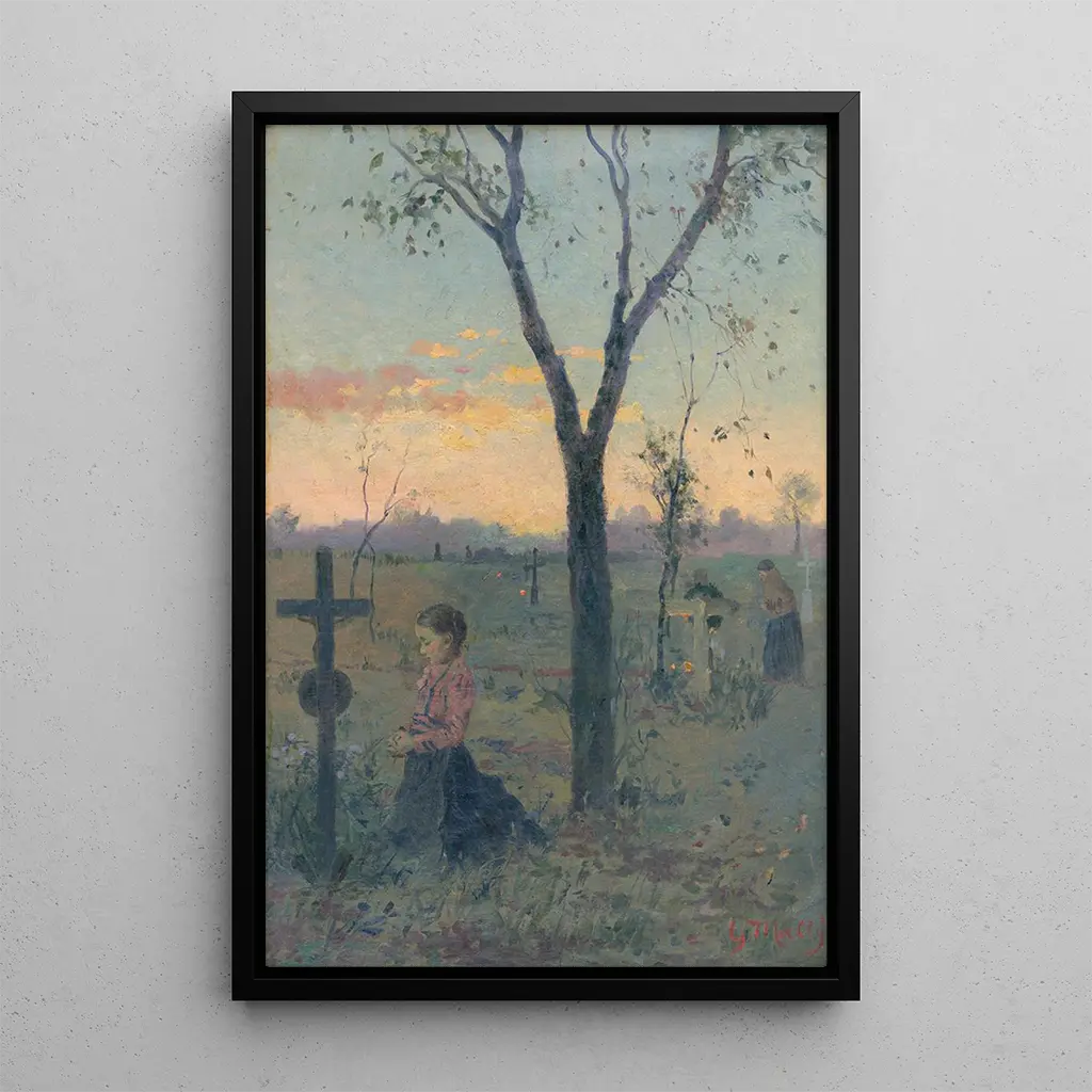 De kunstdruk van "Prière silencieuse sur une tombe" roept een sfeer op van sereniteit en verdriet. De donkere kleuren en de delicate nuances mengen zich om een doek te creëren die uitnodigt tot reflectie. De techniek van de kunstenaar, die speelt met schaduwen en licht, versterkt de emotie die uit dit werk spreekt. Elke penseelstreek lijkt een verhaal te vertellen, dat van een stille hulde, van een bewaarde herinnering. Dit werk, zowel eenvoudig als diepgaand, transporteert ons naar een universum waar de tijd lijkt stil te staan, en moedigt ons aan om de schoonheid van het vergankelijke te bewonderen.