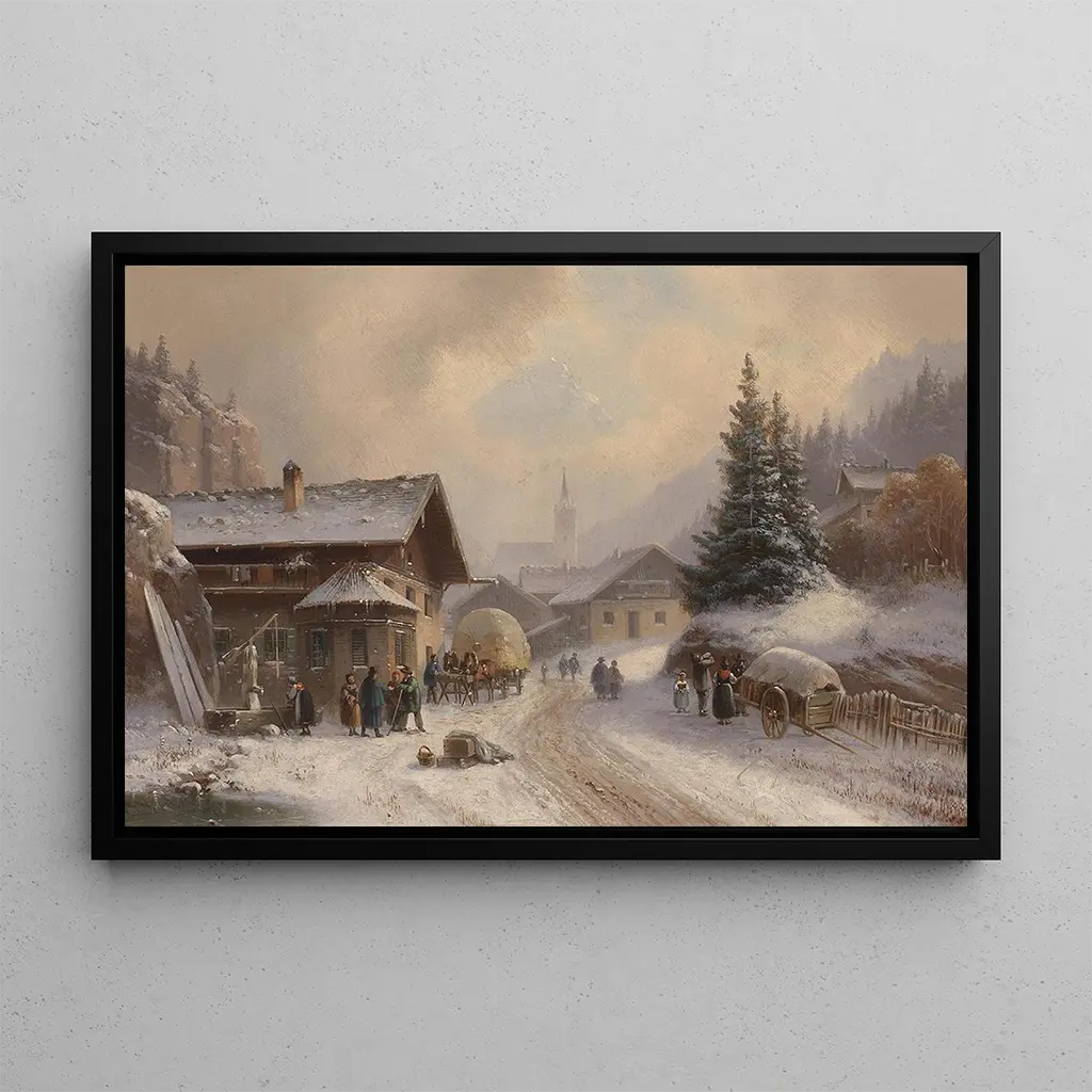 Rue de village en hiver : een idyllisch tafereel doordrenkt met sereniteit "Rue de village en hiver" van Anton Doll roept een rustige en contemplatieve sfeer op, waar de sneeuw de daken en de kasseien delicieus bedekt. De koele tinten van de winter mengen zich met lichtaccenten, waardoor een opvallend contrast ontstaat dat de aandacht trekt. De zorgvuldig uitgebalanceerde compositie nodigt de kijker uit om zich onder te dompelen in dit rustige tafereel, waar de tijd lijkt stil te staan. De minutieuze details van de huizen en de bomen, evenals de discrete aanwezigheid van de dorpelingen, versterken de indruk van een eenvoudig en authentiek leven, typisch voor de landelijke landschappen van die tijd. Anton Doll : een schilder van realisme en natuur Anton Doll, actief in de 19e eeuw, wordt erkend om zijn weergaven van landschappen en scènes uit het dagelijks leven. Zijn stijl, geworteld in het realisme, benadrukt de schoonheid van natuurlijke omgevingen en eenvoudige momenten. Geïnspireerd door de meesters van het landschapsschilderen, specialiseerde Doll zich in het vastleggen van nuances in licht en seizoenen, zoals blijkt uit "Rue de village en hiver". Dit werk illustreert zijn talent om de rust van het landelijke leven op te roepen, terwijl het belang van de natuur in de kunst van zijn tijd wordt benadrukt. Een decoratief kunstwerk met vele voordelen De kunstdruk van "Rue de village en hiver" is een ideale keuze om uw interieur te verfraaien. Of het nu in een woonkamer, kantoor of slaapkamer is, dit doek brengt een serene en rustgevende sfeer, perfect om te ontsnappen aan de drukte van alledag. De kwaliteit van de reproductie garandeert een trouwheid aan de details en kleuren van het originele werk, terwijl het een onmiskenbare esthetische aantrekkingskracht biedt. Door dit schilderij in uw decoratie te integreren, creëert u een ruimte die uitnodigt tot dromen en contemplatie, terwijl u de schoonheid van winterlandschappen viert.