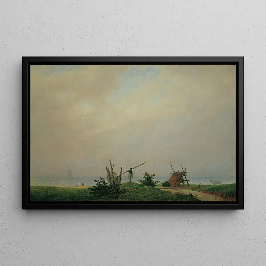 Caspar David Friedrich, iconisch figuur van de Duitse romantiek, wist de essentie van de natuur vast te leggen in zijn werken. Geboren in 1774, werd hij beïnvloed door de landschappen uit zijn jeugd in Pomeranië en door de filosofieën van die tijd, die een terugkeer naar de natuur predikten. Friedrich verkende thema's zoals eenzaamheid, melancholie en spiritualiteit, vaak door menselijke figuren te integreren in grootschalige landschappen. Zijn unieke stijl, die realisme en symbolisme combineert, heeft een generatie kunstenaars beïnvloed en inspireert nog steeds. "Plage avec pêcheur" illustreert perfect zijn aanpak, waarbij een getrouwe weergave van de natuur wordt gecombineerd met een reflectie op de menselijke conditie.