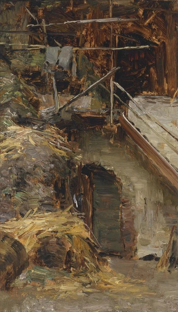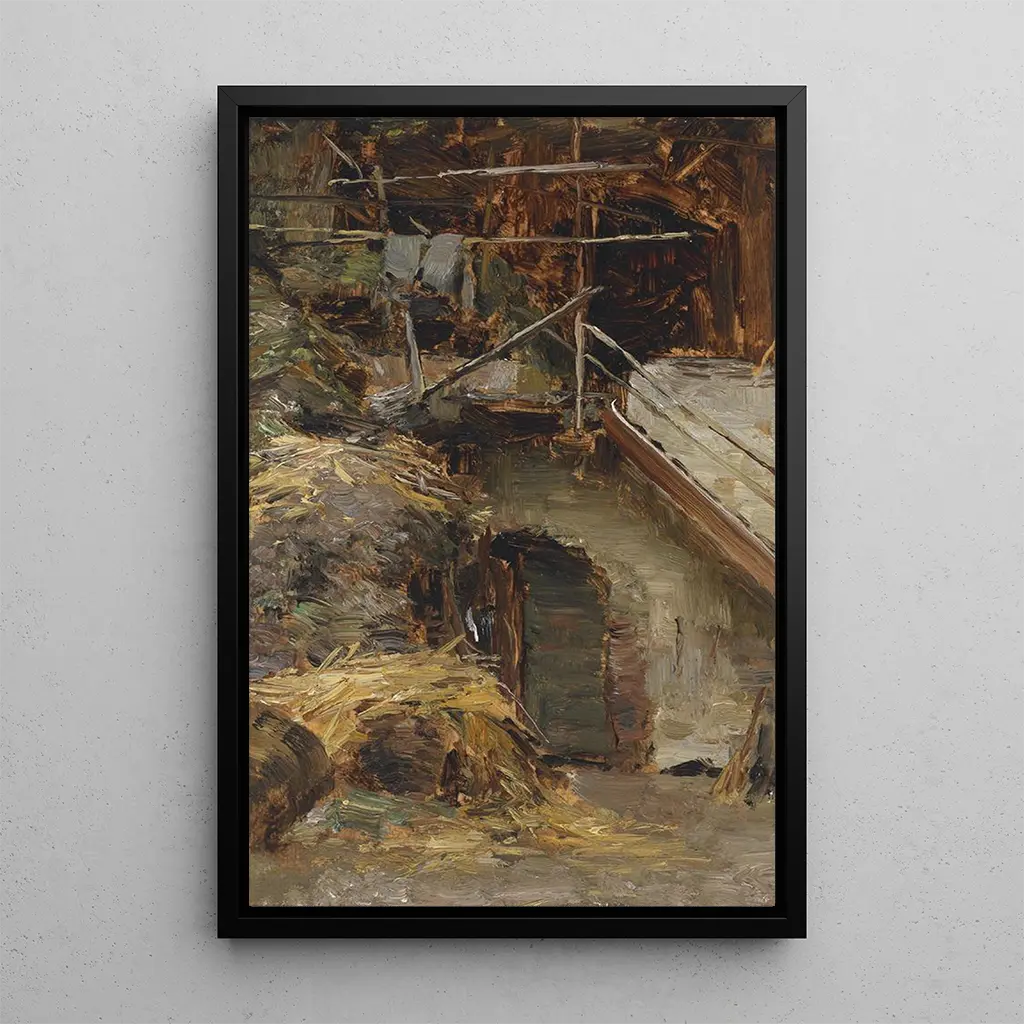 De kunstdruk van "Studie voor een stalinterieur" van Olga Wisinger-Florian brengt de kijker in een landelijk universum vol sereniteit. Dit werk, rijk aan details, beeldt een stalinterieur uit waar het natuurlijke licht door de openingen naar binnen valt, waardoor fascinerende schaduw- en lichtspelingen ontstaan. De aardetinten en ruwe texturen roepen een authentieke en warme sfeer op. De techniek van de kunstenaar, die realisme en impressionisme combineert, laat de levendigheid van deze ruimte voelen, terwijl het een intieme blik biedt op het boerenleven.