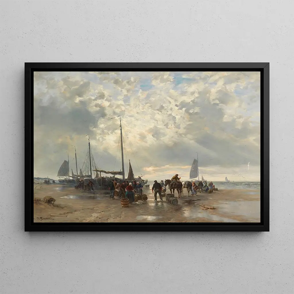Retour des pêcheurs : een maritiem levensmoment doordrenkt van sereniteit In deze kunstdruk van het schilderij Retour des pêcheurs legt de kunstenaar Désiré Thomassin een moment van rust vast aan de kust. De zachte en natuurlijke kleuren, variërend van de rustgevende blauwtinten van de zee tot de warme tinten van het zand, creëren een harmonieuze sfeer. De compositie benadrukt vissers die terugkeren van hun werkdag, hun silhouetten afstekend tegen de heldere achtergrond van de lucht. Thomassin's techniek, die realisme en impressionisme combineert, laat je de zeebries en de geur van zout voelen, en nodigt de kijker uit om zich onder te dompelen in deze scène van alledaags leven. Désiré Thomassin : een meester van het Franse maritieme landschap Désiré Thomassin, actief in de 19e eeuw, wordt erkend om zijn maritieme landschappen die de betekenis van de zee in de Franse cultuur illustreren. Geïnspireerd door de grote meesters van zijn tijd, ontwikkelt hij een stijl die precisie en poëzie combineert. Zijn werken, vaak tentoongesteld in prestigieuze salons, weerspiegelen een periode waarin de landschapsschilderkunst een aanzienlijke bloei doormaakte. Thomassin, met zijn gevoelige aanpak en blik op het maritieme leven, draagt bij aan het artistieke erfgoed van zijn tijd en viert de schoonheid van de Franse kusten en het leven van vissers. Een decoratief stuk met vele voordelen De kunstdruk van het schilderij Retour des pêcheurs is een ideale decoratieve keuze voor diverse ruimtes zoals de woonkamer, kantoor of zelfs de slaapkamer. De afdrukkwaliteit garandeert een opmerkelijke fideliteit aan de details van het originele werk, waardoor je de vakmanschap van de kunstenaar volledig kunt waarderen. De esthetische aantrekkingskracht van dit doek, met zijn rustgevende kleuren en evocatieve scène, brengt een vleugje sereniteit en elegantie in je interieur. Door deze kunstdruk in je decoratie te integreren, breng je niet alleen kunst in huis, maar ook een rijke en inspirerende maritieme geschiedenis.