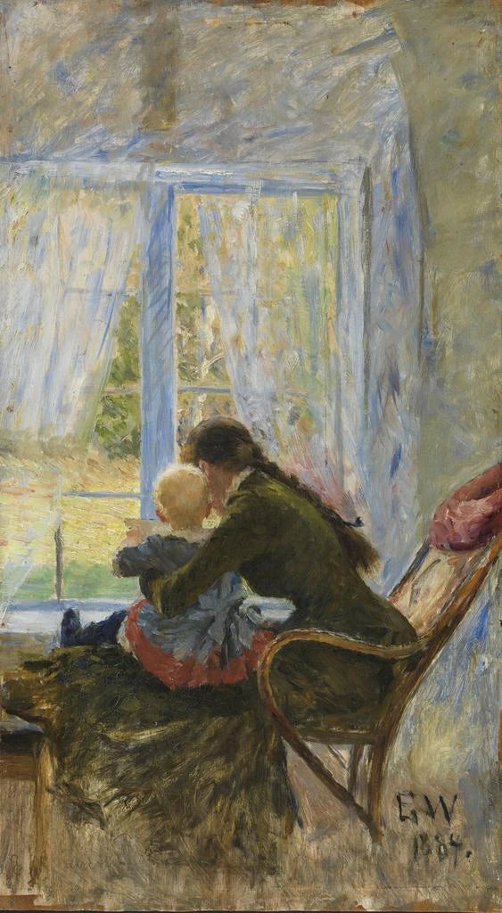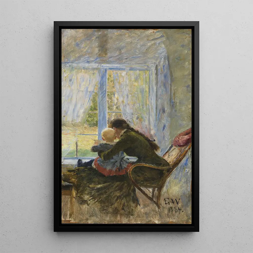 Dans "Toi et Bb", Erik Werenskiold nous offre une scène intimiste où deux figures se retrouvent dans un moment de tendresse et de complicité. Les teintes douces et pastel créent une atmosphère apaisante, tandis que la lumière subtile éclaire les visages des personnages, révélant des émotions profondes. La technique de Werenskiold, qui allie réalisme et touches impressionnistes, permet de capturer la délicatesse des relations humaines. Chaque regard échangé et chaque geste partagé racontent une histoire d'amour et de confiance, invitant le spectateur à s'immiscer dans ce moment privilégié.