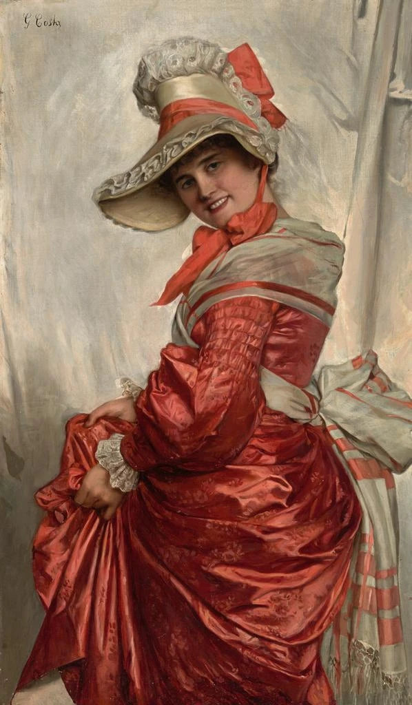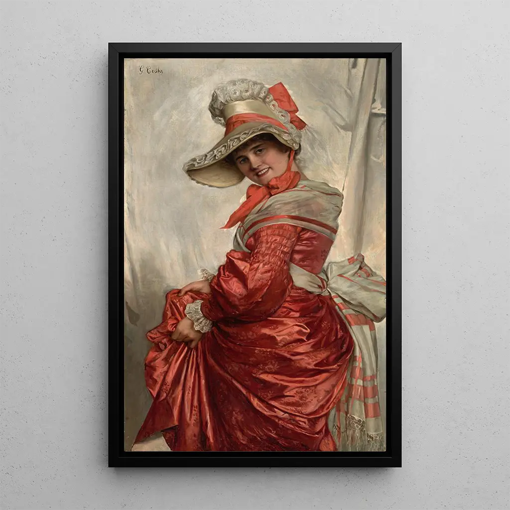 In dit boeiende kunstdruk dompelt Giovanni Costa ons onder in een wereld waar gratie en elegantie samenkomen. De compositie benadrukt een vrouw gekleed in een weelderige jurk, waarvan de fonkelende kleuren de lichtval van een zonnige namiddag oproepen. De minutieuze details van de textuur van de jurk en accessoires voegen een tastbare dimensie toe aan het doek. De sfeer is doordrenkt met sereniteit, en nodigt de kijker uit om de tijdloze schoonheid van mode en vrouwelijkheid te bewonderen. Elke penseelstreek lijkt een verhaal te vertellen, een viering van de kunst van het leven aan het einde van de 19e eeuw.