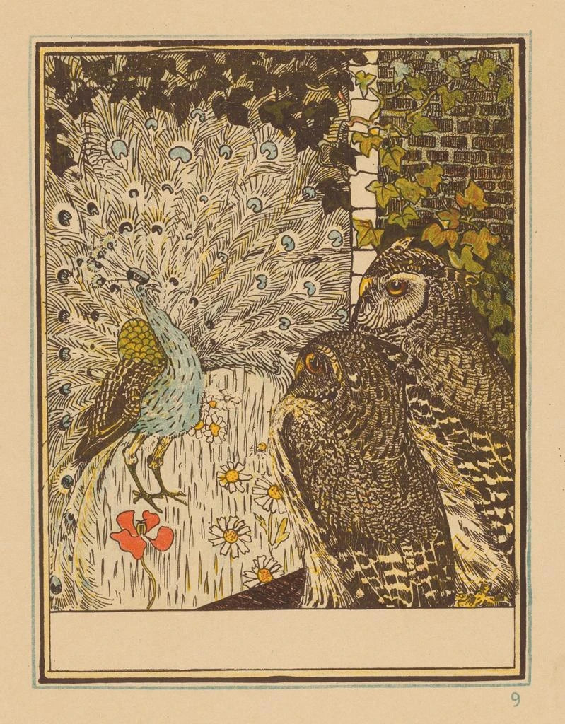 Tonend een pauw en twee uilen - Theo van Hoytema