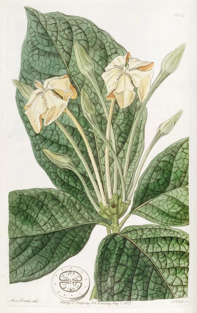 La kunstdruk de Gardenia à feuilles de tissu nous transporte dans un jardin luxuriant, où la beauté des fleurs s’épanouit avec grâce. Les nuances de blanc crémeux contrastent avec le vert profond des feuilles, créant une atmosphère de sérénité et de raffinement. La technique délicate de l’aquarelle, maîtrisée par Sydenham Edwards, met en valeur la texture des pétales et la luminosité des couleurs. Chaque détail est soigneusement rendu, invitant le spectateur à apprécier la subtile complexité de cette fleur emblématique.