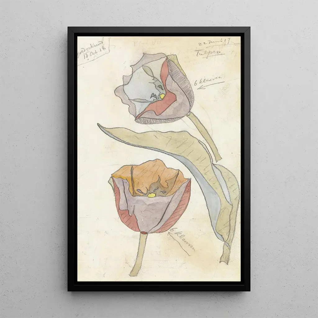 De kunstdruk van Tulpen door Theo Colenbrander is een ware ode aan de vergankelijke schoonheid van bloemen. Dit schilderij, rijk aan levendige kleuren, vangt de essentie van deze delicate bloemen en roept een weelderige tuin in volle bloei op. De tinten rood, geel en paars verweven zich harmonieus, waardoor een boeiend visueel spektakel ontstaat. De aquareltechniek geeft het werk een lichte en vloeiende uitstraling, terwijl de dynamische compositie de blik trekt en uitnodigt tot verwondering. Elke tulp lijkt tot leven te komen en biedt een unieke zintuiglijke ervaring.