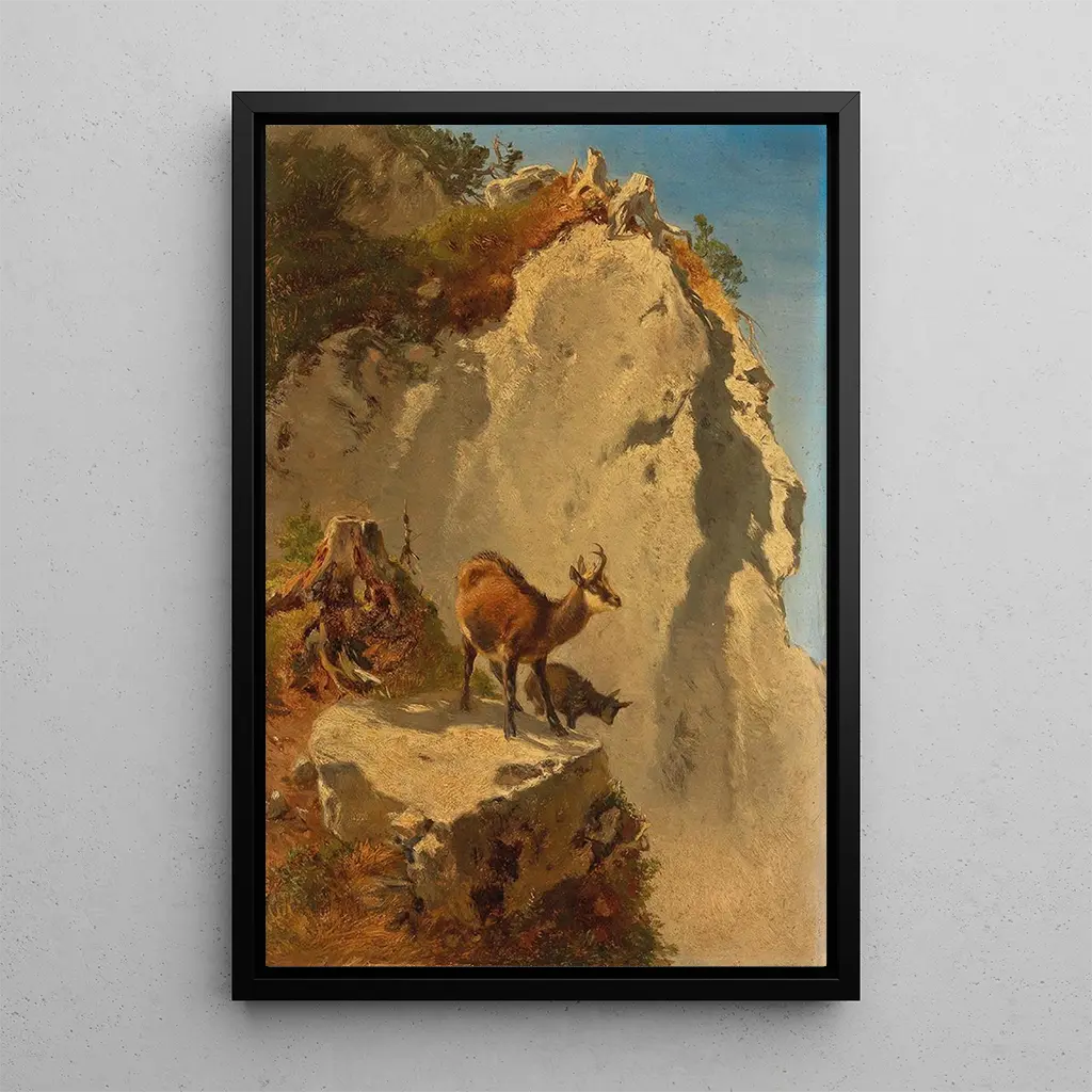 De kunstdruk van het doek Twee gemzen in hoge bergen van Anton Schrödl dompelt ons onder in de majestueuze landschappen van de Alpen. De gemzen, iconische figuren van deze regio, worden afgebeeld met opmerkelijke precisie, bewegend in een wilde en indrukwekkende omgeving. De nuances van groen en bruin, gecombineerd met witte accenten voor de besneeuwde toppen, creëren een opvallend contrast dat de natuurlijke schoonheid van de alpine fauna benadrukt. De techniek van de kunstenaar, die realisme en gevoeligheid combineert, laat je de frisheid van de berglucht en de authenticiteit van deze scène voelen.