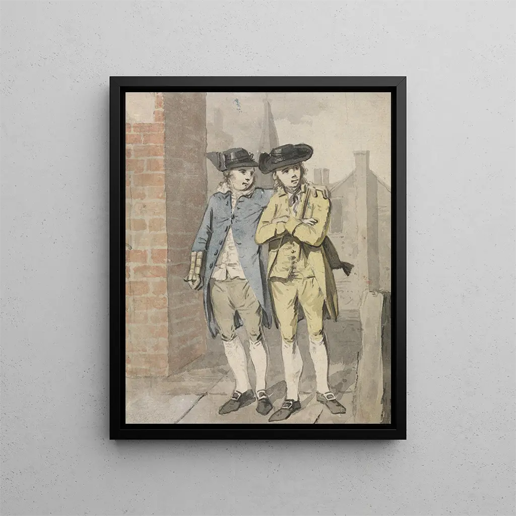 Kunstdruk Deux scholieren - Elias Martin – Boeiende introductie L'œuvre "Deux écoliers" van Elias Martin is een uitnodiging om onder te dompelen in de delicate en intieme wereld van de kindertijd. Dit schilderij, dat zich ontvouwt met een tastbare tederheid, vangt een bevroren moment tussen onschuld en nieuwsgierigheid. In een scène waarin twee jonge jongens naast elkaar staan, slaagt de kunstenaar erin een sfeer van kameraadschap op te roepen, terwijl hij tegelijkertijd de nuances van hun persoonlijkheid laat doorschemeren door hun uitdrukkingen en houdingen. Het zachte licht dat de compositie baadt, versterkt het gevoel van sereniteit en maakt de toeschouwer getuige van een authentieke verbondenheid. Dit werk beperkt zich niet tot een eenvoudige weergave van de kindertijd, maar neemt ons mee in een reflectie over de passage van de tijd en de schoonheid van menselijke relaties. Stijl en uniekheid van de kunstdruk De stijl van Elias Martin onderscheidt zich door zijn vermogen om realisme en gevoeligheid te combineren. In "Deux écoliers" wordt elk detail zorgvuldig waargenomen, van de vouwen in de kleding tot de lichtspelingen op de gezichten van de kinderen. De kunstenaar gebruikt een palet van zachte kleuren, waarin pastelkleuren domineren, wat een rustgevende en dromerige sfeer creëert. De gezichten van de scholieren stralen een levendigheid uit die bijna voelbaar is, en onthult hun aangeboren nieuwsgierigheid en verwondering over de wereld om hen heen. Martin excelleert in de kunst om emoties over te brengen via subtiele gebaren en uitgewisselde blikken, waardoor het werk een grote diepgang krijgt. Elke penseelstreek lijkt een verhaal te vertellen, en de toeschouwer wordt uitgenodigd zich in deze scène te projecteren, de vreugde en onbezorgdheid van de kindertijd te voelen. De kunstenaar en zijn invloed Elias Martin, Zweedse schilder uit de achttiende eeuw, wist zich te onderscheiden door zijn unieke stijl en artistieke visie. Opgeleid in een context waarin neoclassicisme en romantiek begonnen op te komen, wist hij deze invloeden te combineren met een persoonlijke aanpak. Martin heeft vaak thema's verkend die verband houden met de natuur, het dagelijks leven en de kindertijd, wat vooral zichtbaar is in "Deux écoliers". Zijn werk heeft talloze hedendaagse kunstenaars geïnspireerd, die in hem een voorloper zien in de kunst van het vastleggen van [[link]]