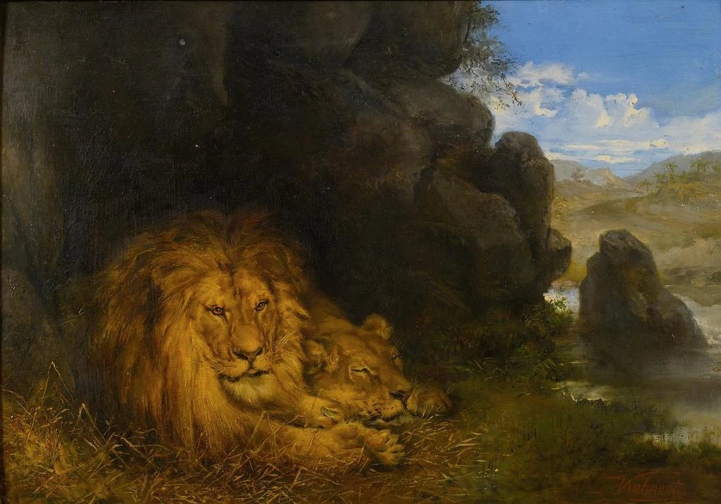 Wilhelm Kuhnert, een Duitse kunstenaar uit het begin van de 20e eeuw, is beroemd om zijn dierenwerken die getuigen van een diepe bewondering voor de wilde fauna. Geïnspireerd door zijn reizen in Afrika, wist hij de schoonheid en majesteit van de dieren te vertalen in zijn schilderijen. Zijn stijl, die zowel nauwkeurig als expressief is, markeerde een tijd waarin dierenkunst een belangrijke plaats innam in de kunstwereld. Deux lions dans une grotte past binnen deze traditie, en illustreert niet alleen de kracht van de dieren, maar ook het belang van het behoud van hun natuurlijke habitat.