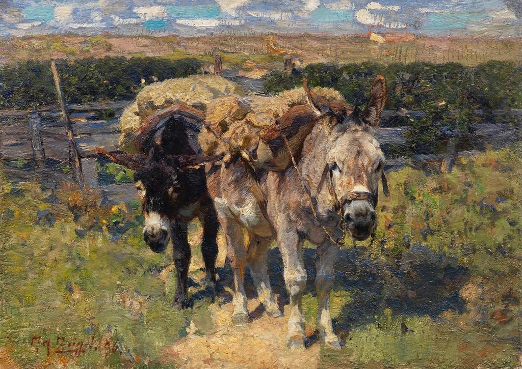 Heinrich von Zügel, geboren in 1850, staat bekend om zijn realistische weergaven van dieren en landschappen. Opgeleid in een artistieke traditie die nauwkeurig observeren waardeert, ontwikkelde hij een stijl die precisie en gevoeligheid combineert. Zügel werd beïnvloed door de naturalistische beweging en streefde ernaar de natuur met opmerkelijke fideliteit weer te geven. Zijn carrière, die zich uitstrekt tot het einde van de 19e en het begin van de 20e eeuw, wordt gekenmerkt door een reeks werken die de schoonheid van fauna en flora vieren. "Deux ezels" is een perfect voorbeeld van zijn vaardigheid om eenvoudige maar veelzeggende momenten vast te leggen.