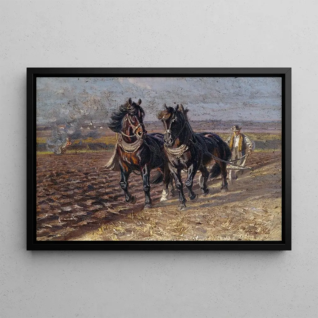 Kunstdruk | Twee zwarte paarden met ploeg - Friedrich Eckenfelder