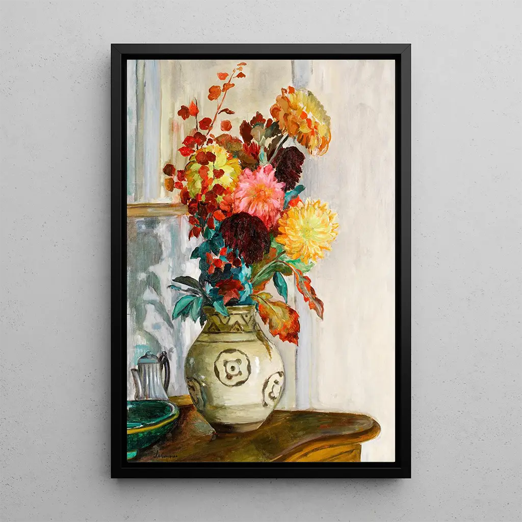 Dans " Vase de chrysanthèmes", Henri Lebasque nous offre une composition florale éclatante, où les chrysanthèmes se déploient dans toute leur splendeur. Les couleurs vives et variées des fleurs, allant des jaunes éclatants aux rouges profonds, s'harmonisent parfaitement avec le vase, créant un contraste saisissant. La technique de Lebasque, caractérisée par des coups de pinceau dynamiques et une utilisation audacieuse de la lumière, donne vie à cette nature morte, transformant un simple arrangement floral en une œuvre vibrante et pleine d'énergie. L'atmosphère qui émane de cette toile est à la fois joyeuse et sereine, invitant à la contemplation.