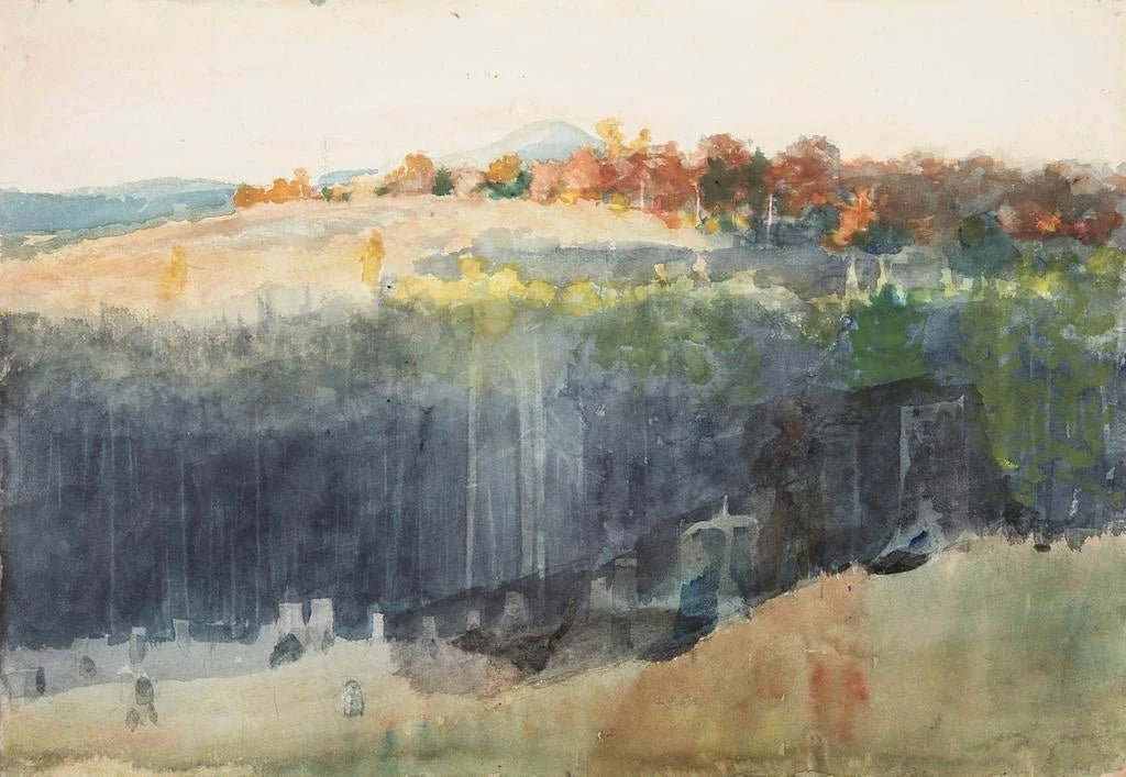 In "Vallée en heuvel" brengt Winslow Homer ons naar het hart van een idyllisch landschap waar de natuur in volle bloei staat. De nuances van groen en blauw mengen zich subtiel, waardoor een rustgevende en contemplatieve sfeer ontstaat. De aquareltechniek, beheerst door de kunstenaar, maakt het mogelijk om het licht en de vochtigheid van de lucht vast te leggen, waardoor elk detail tot leven komt. De golvende heuvels en diepe valleien lijken de kijker uit te nodigen om zich onder te dompelen in dit schilderij, de lichte bries te voelen en te luisteren naar het gefluister van de natuur.