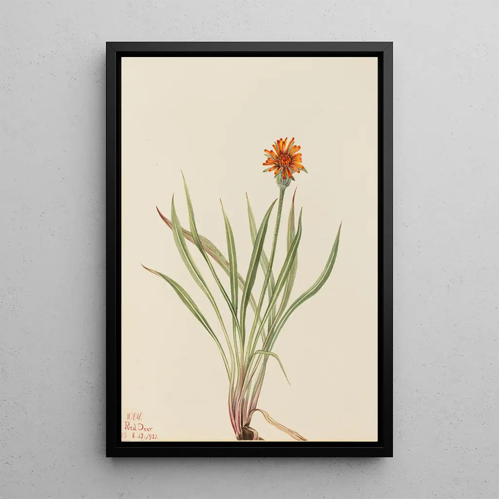 De kunstdruk van de Faux pissenlit Agoseris aurantiaca van Mary Vaux Walcott illustre op subtiele wijze de schoonheid van wilde bloemen. De levendige en heldere kleuren, variërend van stralend geel tot zachte groen, vangen de essentie van de lentebloei. De aquareltechniek, gebruikt door de kunstenaar, geeft een gevoel van lichtheid en transparantie aan het werk, en nodigt de kijker uit om onder te dompelen in een wereld van zachtheid en poëzie. Elk detail wordt minutieus weergegeven, van de delicate bloemblaadjes tot de fijn uitgesneden bladeren, waardoor een sfeer van sereniteit en verwondering over de natuur ontstaat.