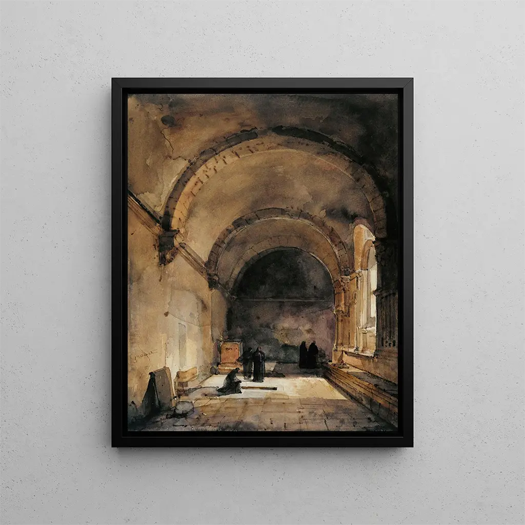 De kunstdruk "Vijf personages onder een boog" van François-Marius Granet is een werk dat de toeschouwer meeneemt in een wereld die zowel intiem als mysterieus is. In deze scène nodigt de kunstenaar ons uit om een bijeenkomst van menselijke figuren te bekijken, vastgelegd onder een architectonische boog die zowel beschermend als onthullend lijkt. De sfeer die uit dit werk straalt, is doordrenkt van sereniteit, maar ook van een zekere melancholie, alsof deze personages bevroren zijn in een moment van diepe reflectie. Het zachte licht dat hun gezichten verlicht en de delicate schaduwen die zich op de muren aftekenen, voegen een bijna spirituele dimensie toe aan deze compositie, en nodigen uit tot een diepere analyse van hun interacties en omgeving.
