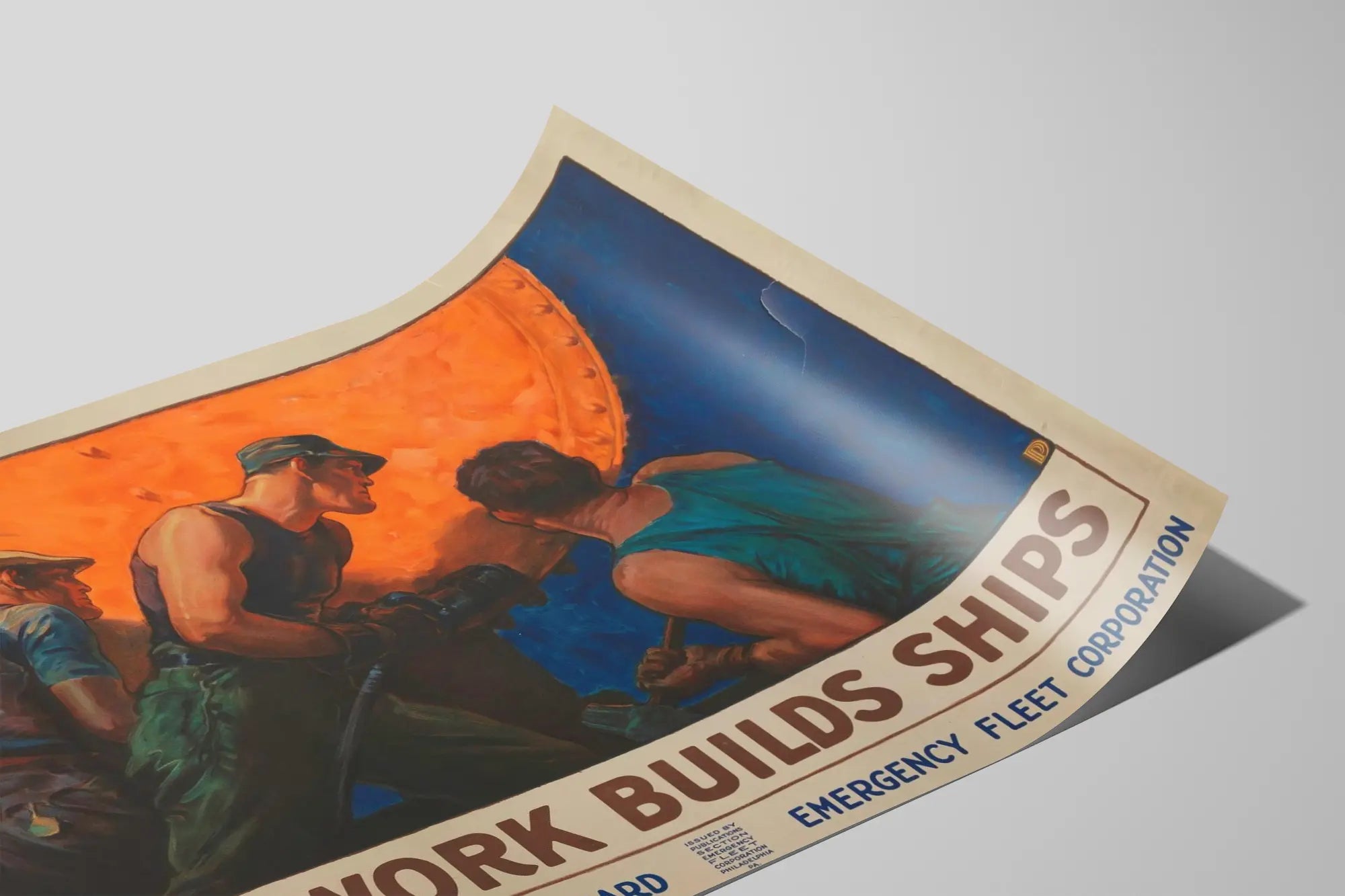 Deze vintage poster belichaamt de kracht en de solidariteit van teamwerk door een scène van arbeiders die bezig zijn met scheepsbouw. Het beeld toont drie geconcentreerde arbeiders, gekleed in klassieke werkkleding, die zich bewegen rond een enorme metalen constructie die verlicht wordt door een warme oranje gloed. Deze compositie weerspiegelt perfect de geest van samenwerking en de precisie die nodig zijn in de scheepvaartindustrie, gesymboliseerd door de bouw van een schip. Met sterke contrasten tussen warme en koude tinten brengt deze vintage poster een authentieke en dynamische esthetiek in elke interieur- of professionele ruimte. Ideaal om een kantoor, vergaderzaal of werkplaats te verfraaien, deze wanddecoratie roept motivatie en collectieve kracht op. De inscripties « TEAMWORK BUILDS SHIPS » en de officiële vermeldingen onderaan de afbeelding geven een retro en historische uitstraling aan dit kunstwerk, en benadrukken het belang van collectiviteit in industriële omgevingen. Deze vintage poster is een perfecte decoratieve keuze voor liefhebbers van authentiek design, voor liefhebbers van de scheepvaartindustrie of voor wie een krachtige en inspirerende boodschap wil integreren in hun muurdecoratie. Dankzij de grafische kwaliteit en artistieke stijl is deze affiche zowel motiverend als esthetisch, en gemakkelijk te integreren in diverse interieurstijlen, van industrieel tot modern.