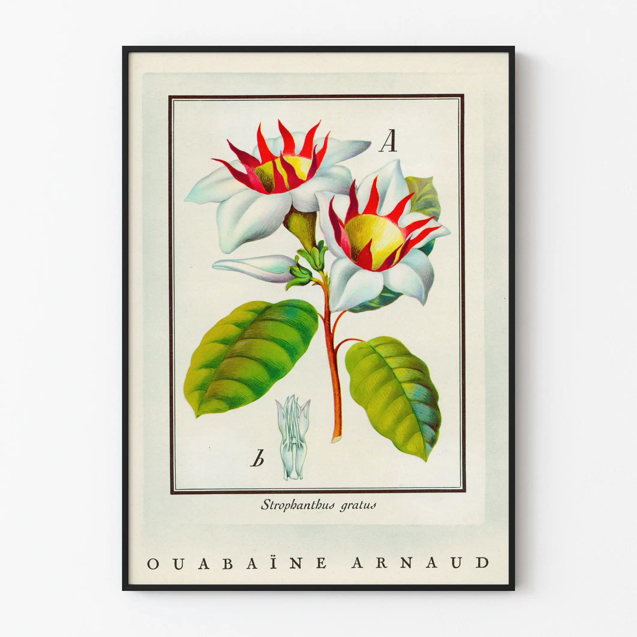 Breng een vleugje elegantie en natuurlijkheid in uw interieur met dit vintage botanische affiche van de Strophanthus gratus, ook bekend als Ouabaïne Arnaud. Deze poster is een prachtige muurdecoratie die klassieke esthetiek combineert met de schoonheid van de natuur. Het gedetailleerde ontwerp benadrukt twee witte bloemen met delicate, stralende bloemblaadjes, met gele hartjes gestreept met rood, omringd door grote groene bladeren die rechtop staan op een fijne steel. Dit botanische schilderij roept de wetenschappelijke precisie op van oude illustratieve platen, perfect voor liefhebbers van planten en retro decoratie.