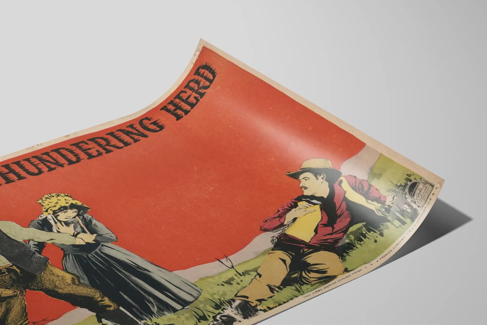 Ontdek dit vintage affiche getiteld "The Thundering Herd", geïnspireerd door het werk van Zane Grey, een klassieker van de Amerikaanse western. Deze wanddecoratie roept een typische scène uit het Verre Westen op, met drie figuren in een open landschap en een intens rode hemel op de achtergrond. Het opvallende contrast tussen de warme tinten en de geklede figuren in sobere kleuren creëert een indrukwekkend visueel effect. Dit affiche is een ideaal poster voor liefhebbers van wanddecoratie met western- of vintage-thema, en brengt een dramatische en nostalgische sfeer in elke ruimte. Gemakkelijk te inlijsten, kan het zowel in een woonkamer, kantoor als in een recreatieruimte worden geplaatst, en voegt een vleugje originaliteit en klassieke filmgeschiedenis toe. De grafische stijl en de typografische tekens bovenaan het affiche versterken de retro- en authentieke uitstraling van dit stuk. Perfect voor liefhebbers van oude affiches en inspirerende decors, is dit "The Thundering Herd" een elegante keuze voor een unieke en evocatieve wanddecoratie.