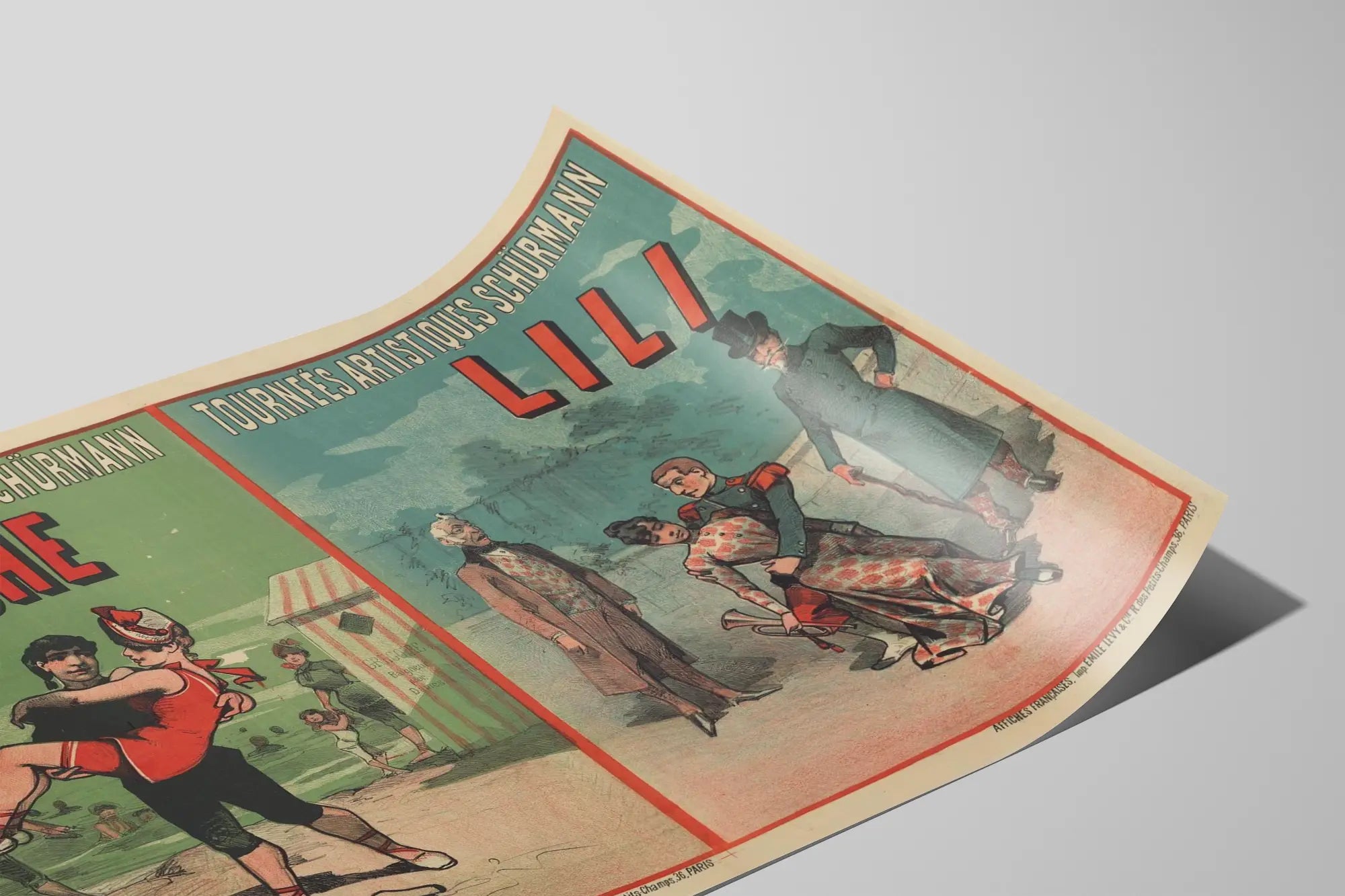 Ontdek dit originele en vintage affiche van de Artistieke Toeren Schürmann, met voorstellingen van Niniche en Lili. Deze wanddecoratie bestaat uit twee aparte illustraties naast elkaar, gedrukt op een pastelachtergrond in tinten groen en blauw-grijs, versterkt door een rode lijst. De poster toont personages in theatrale of artistieke scènes, met een grafische stijl die typisch is voor oude Franse affiches. Aan de linkerkant is Niniche, gekleed in rood en met gespen sandalen, gedragen in de armen van een jonge man in het zwart, op de achtergrond een strand met zwemmers en gestreepte cabines. Rechts staat Lili, elegant in een bloemenpatroon jurk, ondersteund door een militair in uniform, omringd door mannen met een nieuwsgierige of bezorgde blik, in een tuin- of binnenplaatssfeer, versterkt door bewolkte hemel. De typografie boven elk deel benadrukt de titel "Artistieke Toeren Schürmann", waardoor de poster een oude promotionele uitstraling krijgt. Dit vintage decoratieve schilderij is ideaal voor een retro sfeer, en brengt een vleugje theater- en showgeschiedenis in uw interieur. Als wandposter is dit beeld perfect voor liefhebbers van artistieke en oude wanddecoratie, die op zoek zijn naar een affiche met authentiek en verhalend karakter. De uitgebalanceerde compositie en subtiele kleurgebruik passen zowel in een klassiek interieur als in een meer eclectische stijl, en onderstrepen de elegantie en nostalgie van de artistieke toeren uit het verleden. Elke affiche helpt een theatrale en feestelijke wereld te hercreëren, uitnodigend tot ontdekking en contemplatie. Deze originele poster maakt deel uit van een serie Franse affiches gedrukt door Émile Lévy & Cie, gevestigd in Parijs, wat het een cultureel en historisch karakter geeft. Voltooi uw wanddecoratie met dit vintage kunstwerk dat de kunst en het spektakel viert door middel van een rijke en evocatieve grafische voorstelling.