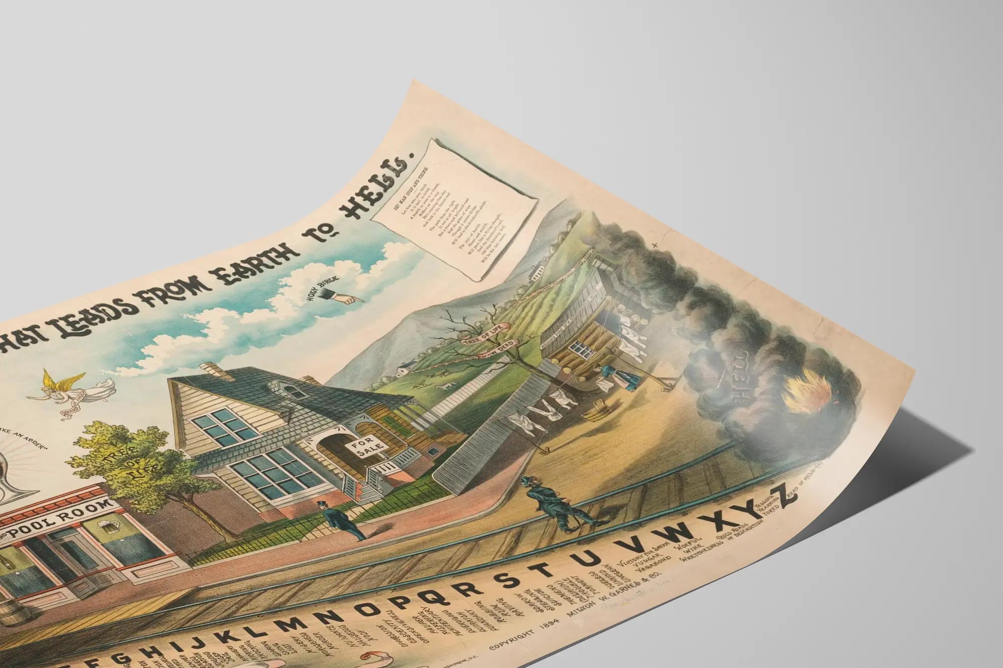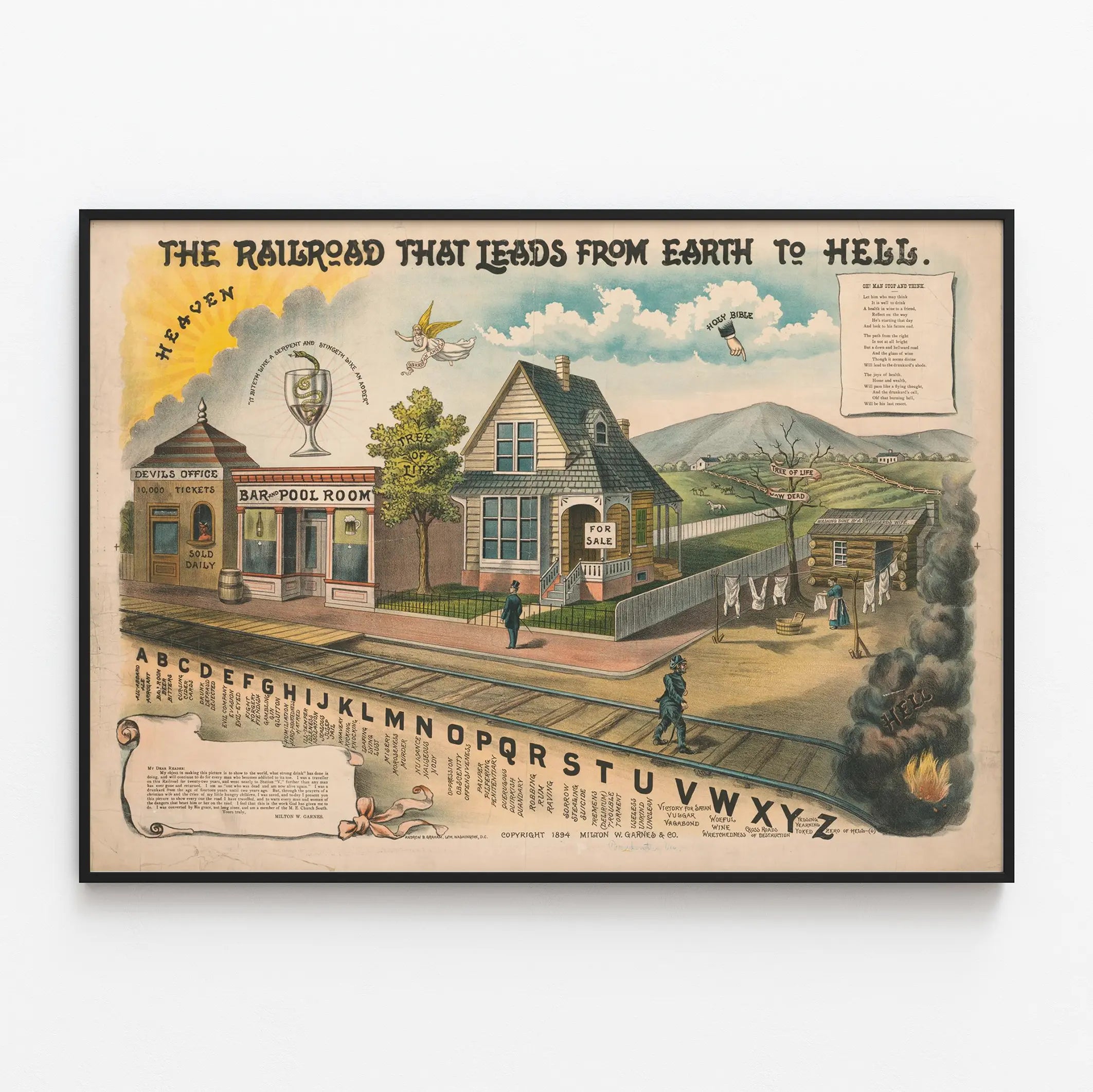 Deze vintage poster getiteld "De Spoorweg Die Van Aarde Naar de Hel Leidt" is een originele en symbolische illustratie die een moreel pad voorstelt in de vorm van een spoorlijn die van de Aarde naar de Hel leidt. Deze boeiende poster onderscheidt zich door zijn retrostijl en gedetailleerde grafisch ontwerp, waarbij visuele en tekstuele elementen samenkomen in een uniek narratief. Het maakt deel uit van wanddecoratie die een vleugje authenticiteit en geschiedenis aan elk interieur toevoegt.