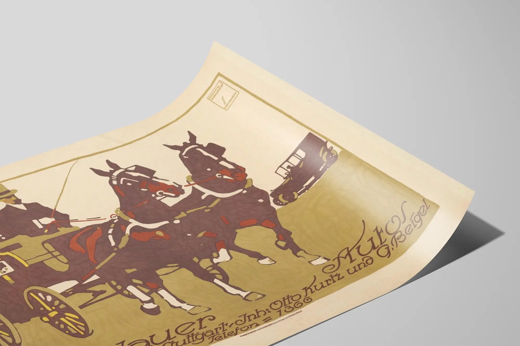 Deze vintage affiche toont een elegante scène die traditie en moderniteit combineert, met de Landauer Auto's uit Stuttgart in de hoofdrol. Het beeld, gemaakt door de kunstenaar Ludwig Hohlwein, beeldt twee mannen in stijlvolle, historische kleding uit, met hoge hoeden, die een koets trekken door twee paarden. Op de achtergrond benadrukt een oud automobiel de overgang tussen traditionele vervoersmiddelen en moderne auto's. Het gebruik van een strakke grafische stijl en een palet van sobere maar contrasterende kleuren geeft een zeer gewaardeerde retro uitstraling voor wanddecoratie. Deze poster is ideaal voor liefhebbers van art deco, geschiedenis van vervoer of iedereen die een vleugje vintage elegantie in zijn interieur wil integreren. Ze vindt gemakkelijk haar plek in de woonkamer, kantoor of een ruimte voor thematische decoratie. De affiche kan zo een verzameling oude posters aanvullen of dienen als een opvallend element in een eigentijdse inrichting. Dit wandpaneel weerspiegelt ook het Duitse artistieke vakmanschap met een evenwichtige compositie, waarin de strakke lijnen van de paarden en de koets de scène domineren, en de dynamiek en verfijning van die tijd benadrukken.