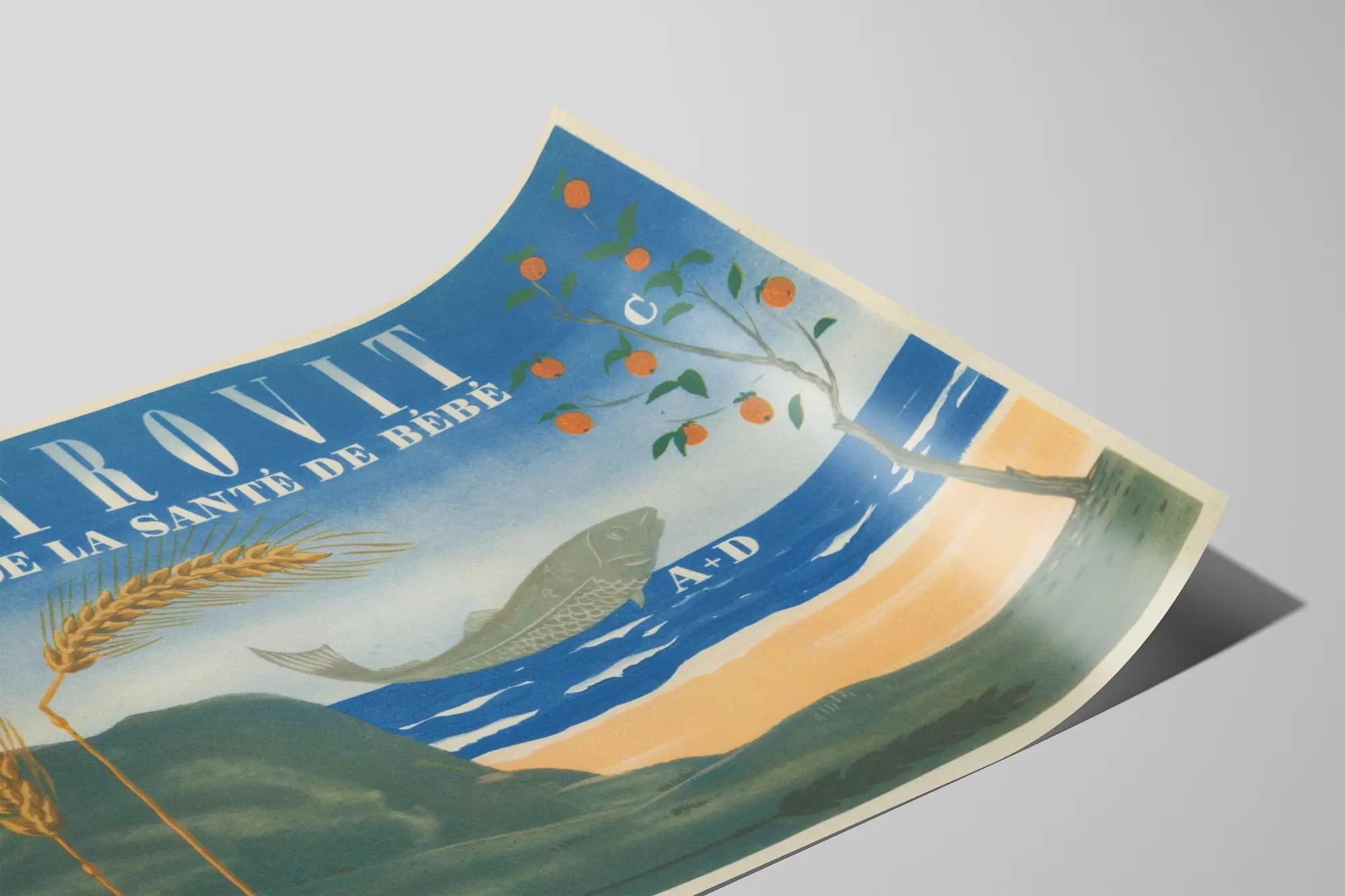 Ontdek deze vintage affiche van Nestrovit die de ABCD van de babygezondheid benadrukt, een echt wanddecoratiestuk in retro- en educatieve stijl. Deze poster illustreert op eenvoudige en kleurrijke wijze de essentiële vitamines voor de kindergezondheid, weergegeven door natuurlijke elementen. Op een vervaagde achtergrond van de blauwe hemel tot de zandkleurige bodem, staan een tarwehalm verbonden met vitamine B1, een vis die de vitamines A en D symboliseert, en een fruitboom met oranje vruchten die herinneren aan vitamine C. Dit beeld brengt een duidelijke en leerzame boodschap over de voordelen van vitamines voor kleintjes, in een sobere vormgeving met zachte tinten, geschikt voor een warme en natuurlijke sfeer in een kinderkamer of een verzorgingsruimte. Deze decoratieve affiche is ideaal voor liefhebbers van vintage wanddecoratie of voor wie een element wil toevoegen dat zowel esthetisch als informatief is over de kindergezondheid. Het strakke ontwerp en de rustgevende kleuren maken het mogelijk om elke interieurstijl te verfraaien, met een vleugje authenticiteit en charme aan je muren. Perfect als ingelijste poster, wandpaneel of onderdeel van een thematische muurdecoratie gewijd aan gezondheid of welzijn van kinderen, combineert deze wanddecoratie charme en functionaliteit. Geef je ruimte een vintage accent dat de belangrijkheid van vitamines in de groei herinnert, terwijl het een unieke artistieke toets toevoegt. Dit wandpaneel is een uitstekende keuze voor wie kunst en educatie wil combineren in hun interieurdecoratie.