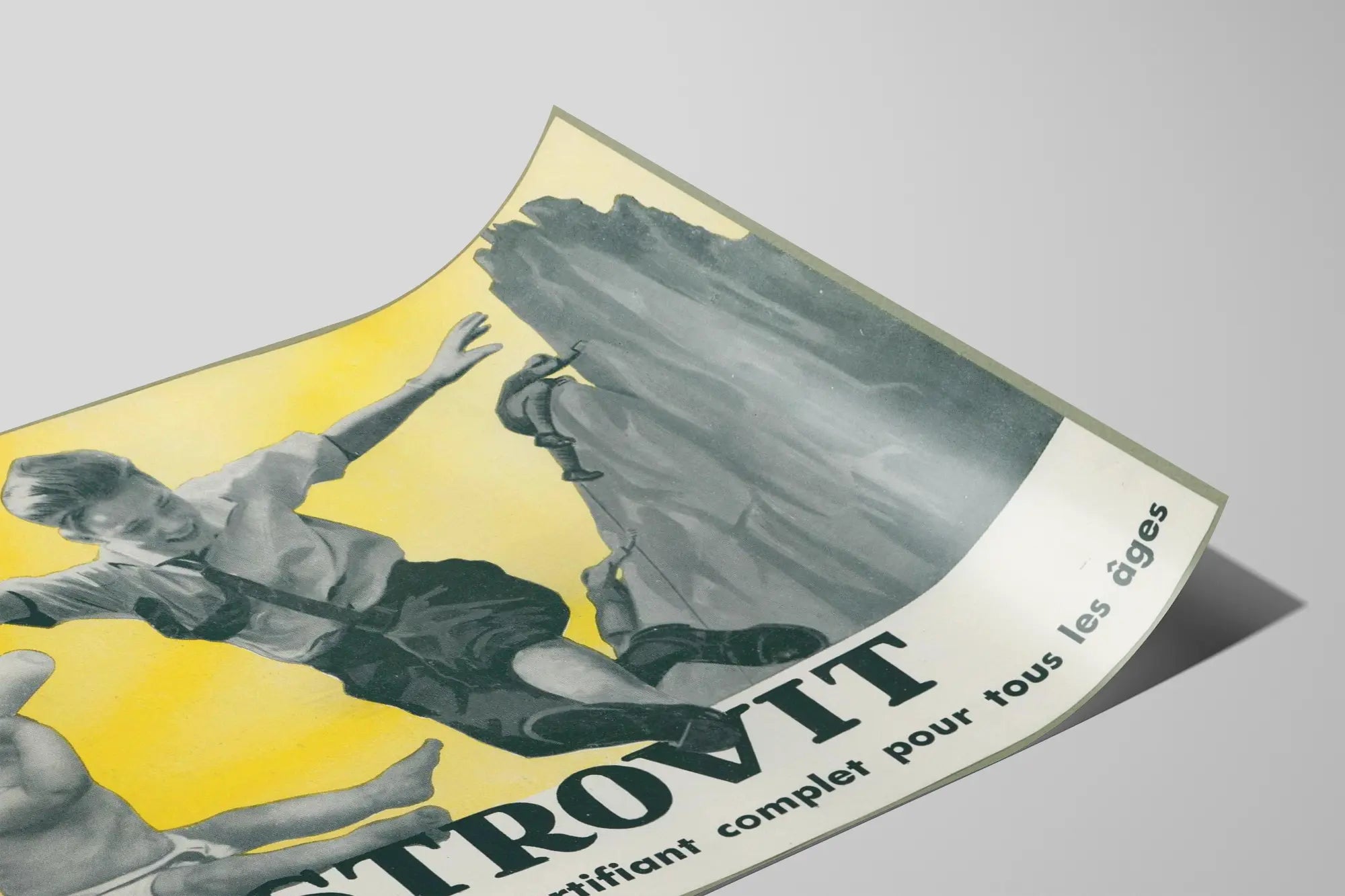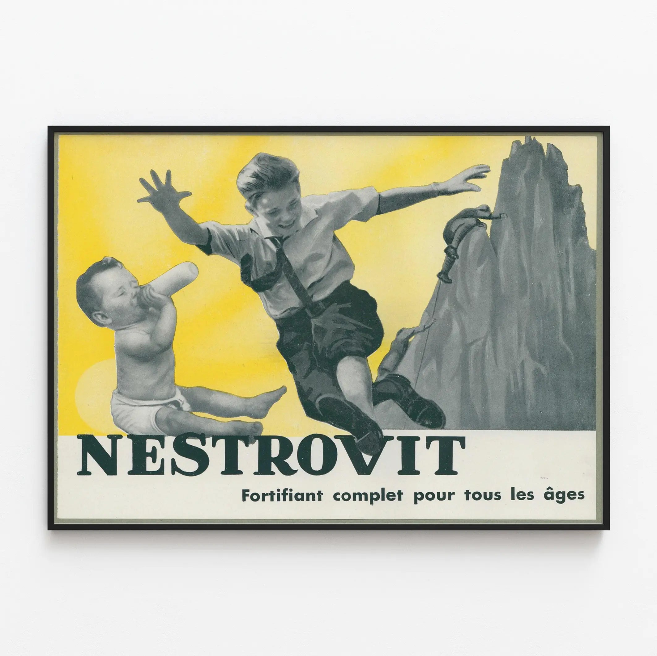 Deze vintage Nestrovit kunstdruk is een uniek stuk muurdecoratie dat een retro en nostalgisch accent toevoegt aan elk interieur. Ze beeldt een kind staand in een overhemd en stropdas uit dat vrolijk springt, vergezeld door een baby die uit een fles drinkt, op een heldergele achtergrond die vitaliteit en energie oproept. Op de achtergrond klimmen bergbeklimmers een rotswand op, wat kracht en vastberadenheid symboliseert en zo de boodschap van het product versterkt: een volledige versterker voor alle leeftijden. Deze originele reclameposter is perfect geschikt voor het decoreren van gezellige ruimtes zoals een woonkamer, keuken of kantoor, en voegt een vleugje nostalgie toe. Gemaakt met materialen die geschikt zijn voor kunstdrukken, is hij ideaal voor liefhebbers van vintage muurdecoratie die hun collectie willen verrijken met een beeld dat zowel dynamisch als esthetisch is. Het contrast tussen de zwart-wit figuren en de gele achtergrond maakt deze kunstdruk aantrekkelijk en gemakkelijk te integreren in verschillende stijlen van inrichting, van klassiek tot modern. Of u nu gepassioneerd bent door oude reclameposters of gewoon op zoek bent naar een originele muurdecoratie, deze Nestrovit kunstdruk is een uitnodiging tot ontdekking en het uitbeelden van gezondheid en kracht via een eenvoudige en ontroerende beeldtaal. Breng een vleugje dynamiek en geschiedenis aan uw muren met deze nostalgische kunstdruk die zowel volwassenen als jongeren aanspreekt.
