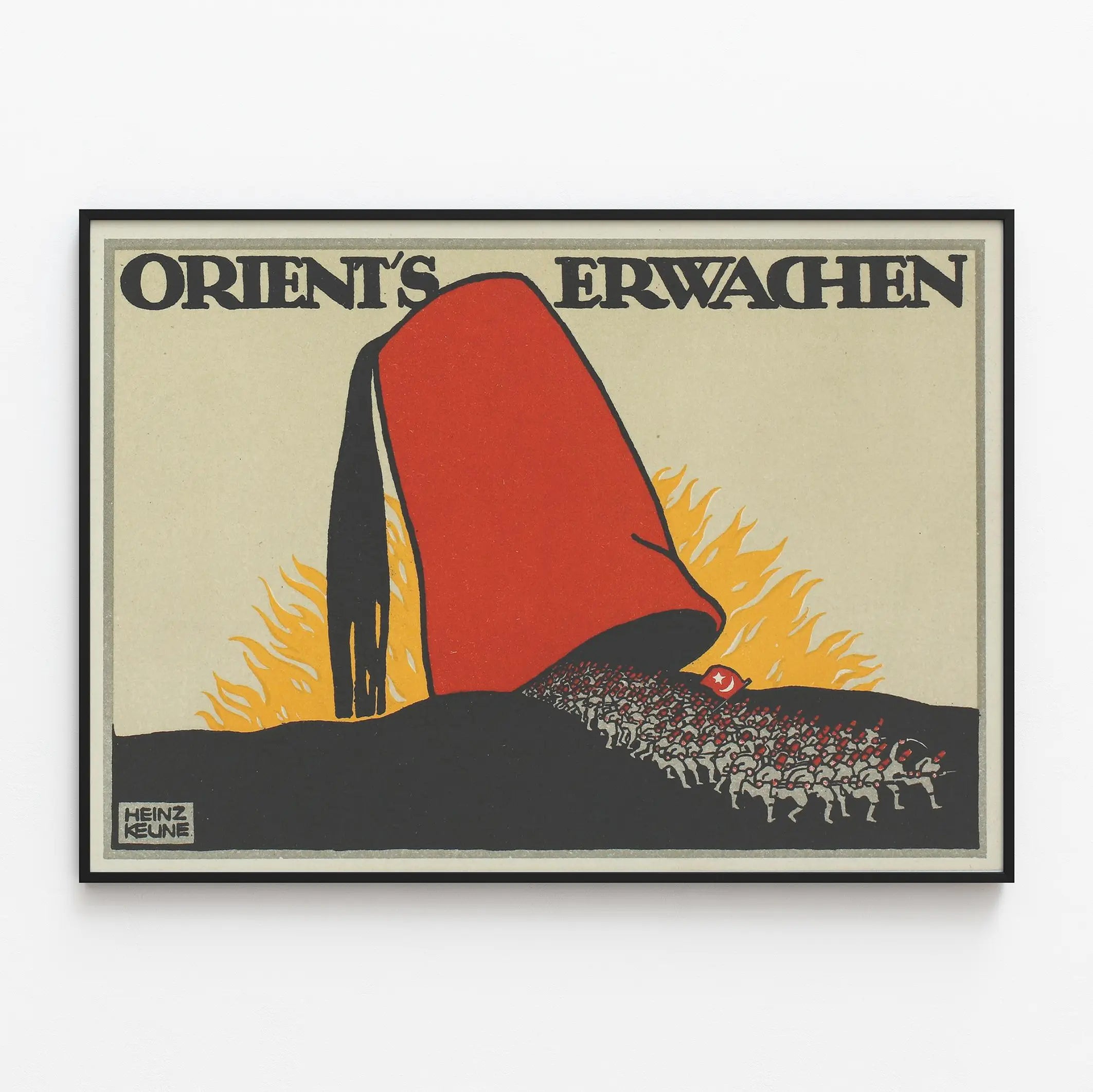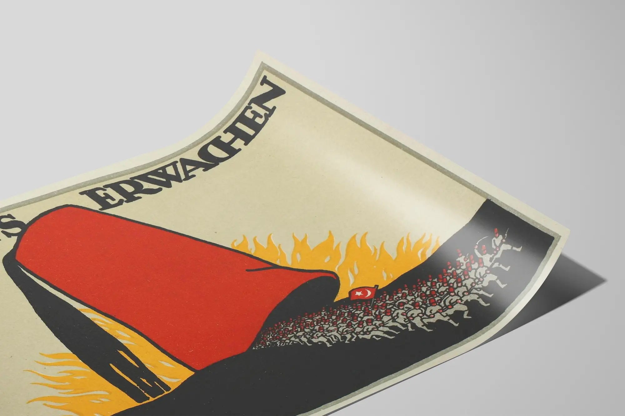 Deze opvallende grafische poster is een origineel muurdecoratie die onmiddellijk de aandacht trekt. Dominant door een grote rode fez met strakke contouren, toont hij een drukke menigte in beweging, afgebeeld in zwart en grijs met kleine rode accenten en een vlag versierd met een halve maan. De donkere silhouet van de menigte contrasteert met een lichte achtergrond en gestileerde gele vlammen, wat een gevoel van ontwaken of intense bewustwording versterkt. De tekst "ORIENT'S ERWACHEN" in grote zwarte letters omlijst de compositie bovenaan, wat een visueel evenwicht brengt aan het geheel. Met zijn strakke grafische stijl, beperkte maar levendige kleurenkeuze, past deze poster perfect binnen een vintage muurdecoratietrend, ideaal om te accentueren in een modern of retro interieur. Deze affiche voegt een historische en esthetische dimensie toe aan elke ruimte, of het nu een woonkamer, kantoor of leeszaal is. Ze kan ook harmonieus worden geïntegreerd in een collectie vintage affiches of posters, die een echt contrast en visuele authenticiteit bieden. Zijn geometrische grafische stijl, met strakke lijnen en een duidelijk gebruik van contrast en vlakke kleuren, maakt het tot een krachtig muurdecoratie-element. Dit soort muurdecoratie vindt zijn plek in omgevingen die kunst, symboliek en vintage design willen combineren. Een prachtig stuk voor liefhebbers van oude affiches of voor wie zijn interieur wil verrijken met een muurkunstwerk dat geschiedenis en visuele dynamiek uitstraalt.