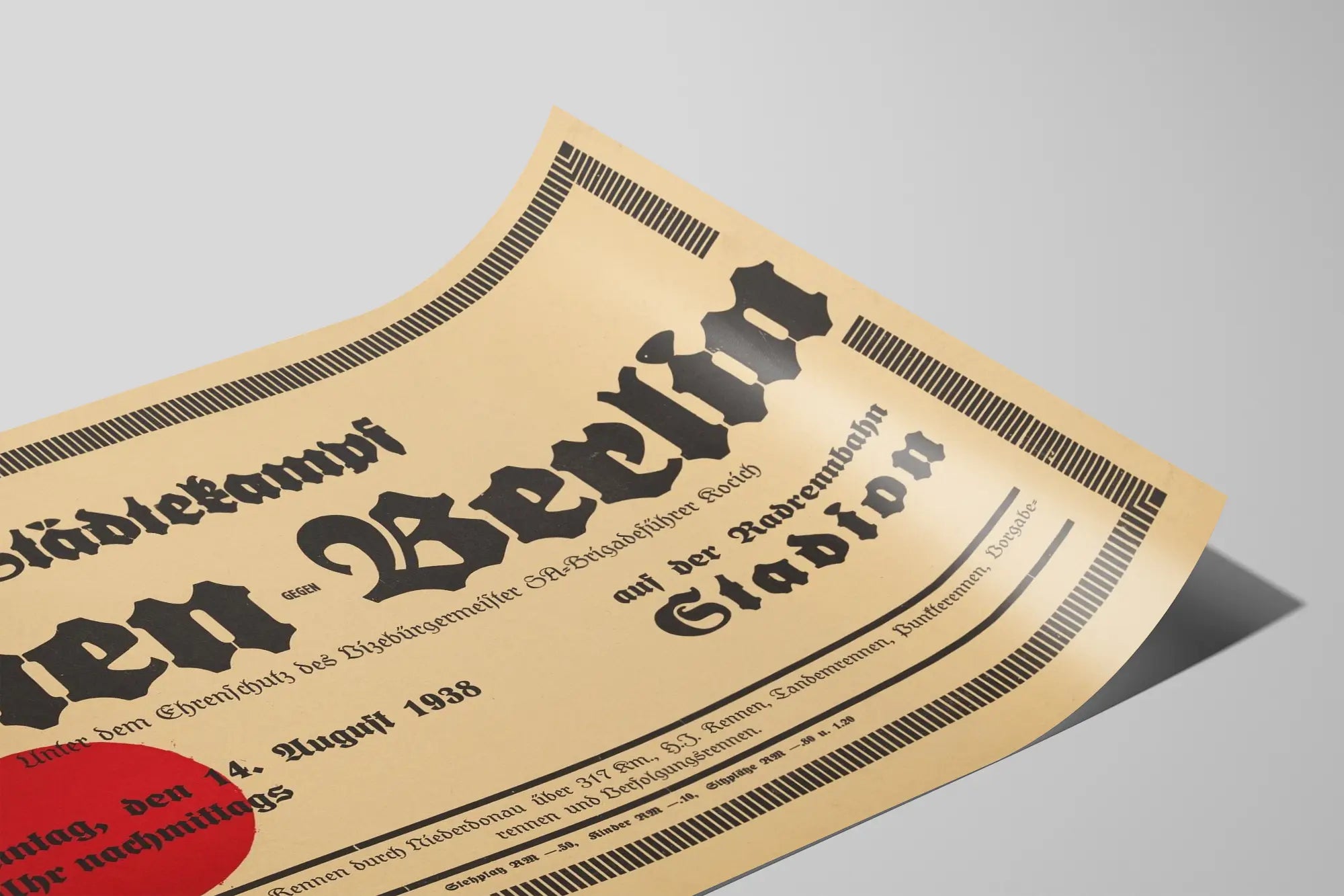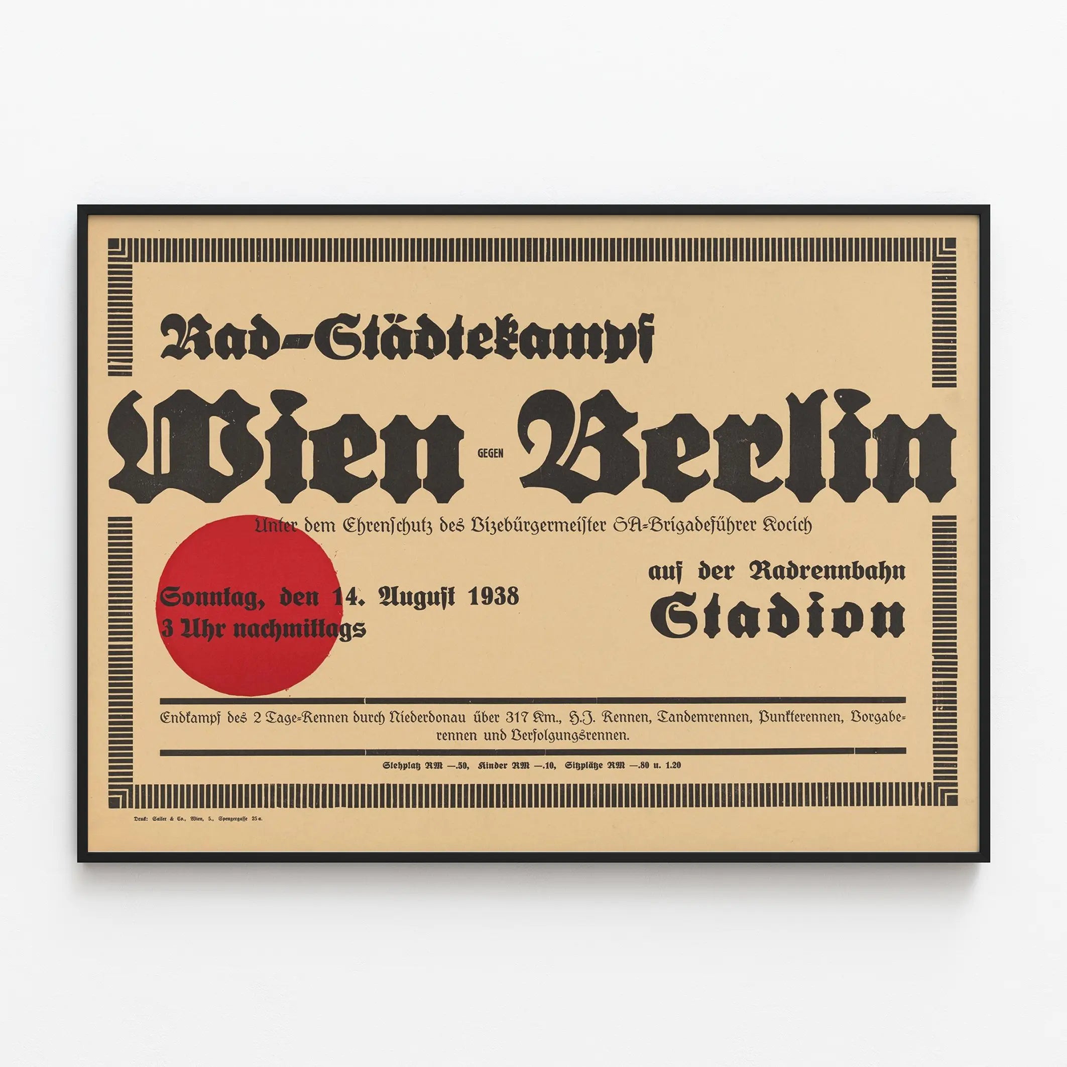 Deze vintage affiche getiteld « Rad-Stadtekampf Wien gegen Berlin » legt een historisch sportevenement vast, een wielerwedstrijd tussen de steden Wenen en Berlijn uit 14 augustus 1938. Deze poster vormt een originele en iconische muurdecoratie voor liefhebbers van geschiedenis, sport en grafisch ontwerp uit het begin van de twintigste eeuw. Met zijn beige achtergrond en zwarte gotische typografie straalt dit typografische kunstwerk een opvallende retrostijl uit die gemakkelijk te herkennen is. Deze muurdécoratie benadrukt de namen van de steden in grote gotische letters, met een sterk contrast door een eenvoudige rode cirkel die de grafische codes van die periode herinnert. De compositie wordt omgeven door een zwart geometrisch motief dat doet denken aan de art deco-esthetiek, waardoor het een waardevol decoratief element voor de muur wordt. De affiche kondigt een wielerwedstrijd op de baan aan (« Radrennbahn Stadion »), inclusief verschillende soorten races, zoals Amerikaanse wedstrijden, tandemwedstrijden en achtervolgingen, wat het een waardevol document maakt van de sportieve wielerevenementen uit die tijd. Deze poster is een uniek stuk dat vanzelfsprekend een plaats vindt in een vintage muurdecoratie, en brengt een vleugje authenticiteit en geschiedenis. Ze spreekt zowel verzamelaars van oude affiches als liefhebbers van muurdecoratie aan die op zoek zijn naar een opvallend retro ontwerp en een originele sportthema. Of het nu voor een modern interieur is of een ruimte gewijd aan wielersport, dit kunstwerk met sobere en krachtige lijnen brengt de sfeer van weleer terug en weet te overtuigen door zijn grafische eenvoud. Deze historische affiche is gedrukt op sepia-getint papier dat een warme uitstraling geeft aan uw interieurdecoratie. De balans tussen tekst en ruimte, evenals de keuze van oude lettertypes, maken het tot een echt muurkunstwerk dat karakter geeft aan een muur. Het is een perfect decoratief object voor een kantoor, sportzaal, vintage themacafé of woonkamer, en brengt een stukje Europese geschiedenis in het interieur. Gun uzelf deze zeldzame en authentieke poster om uw collectie unieke en betekenisvolle muurdecoraties te verrijken. Perfect voor liefhebbers van wielrennen, oude grafische kunst en Europees erfgoed, combineert deze muurafbeelding esthetiek en historische herinnering met elegantie.