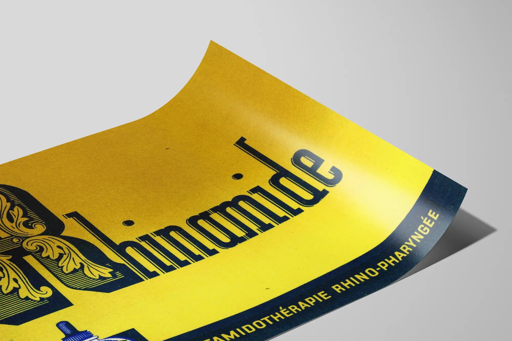 Ontdek deze vintage poster met reclame voor het product rhinamide, gebruikt in rhinofaryngale sulfamedicatie. Deze retro geïnspireerde wanddecoratie benadrukt een gedetailleerde fles die het medicijn voorstelt, met een typografisch ontwerp gekenmerkt door een grote letter « R » versierd met plantaardige motieven, wat een oude en elegante stijl toevoegt. De poster speelt met een contrast van goudgeel en zwart, waardoor de leesbaarheid van de tekst en de visuele impact worden versterkt. Dit affiche onderscheidt zich door zijn grafische samenstelling die doet denken aan oude farmaceutische advertenties, ideaal voor een thematische of vintage wanddecoratie. Perfect om een medische ruimte, een oude apotheek of een interieur met retro decoratie te verlevendigen, brengt deze poster een authentieke en originele toets. De duidelijke vermelding « sulfamedicatie rhino-faryngée » en de informatie over de samenstelling van het product (sulfamide, efedrine, elycaïne) maken deze poster tot een verzamelobject of decoratief stuk voor liefhebbers van historische en medische ontwerpen. Geef karakter en een unieke sfeer aan uw muren met deze vintage reclameposter rhinamide, die decoratieve typografie, nauwkeurige illustratie en een sobere maar krachtige kleurenpalet combineert. Een wandstuk dat de aandacht zal trekken en uw woon- of werkruimtes verrijkt met zijn esthetiek en suggestieve visuele inhoud.