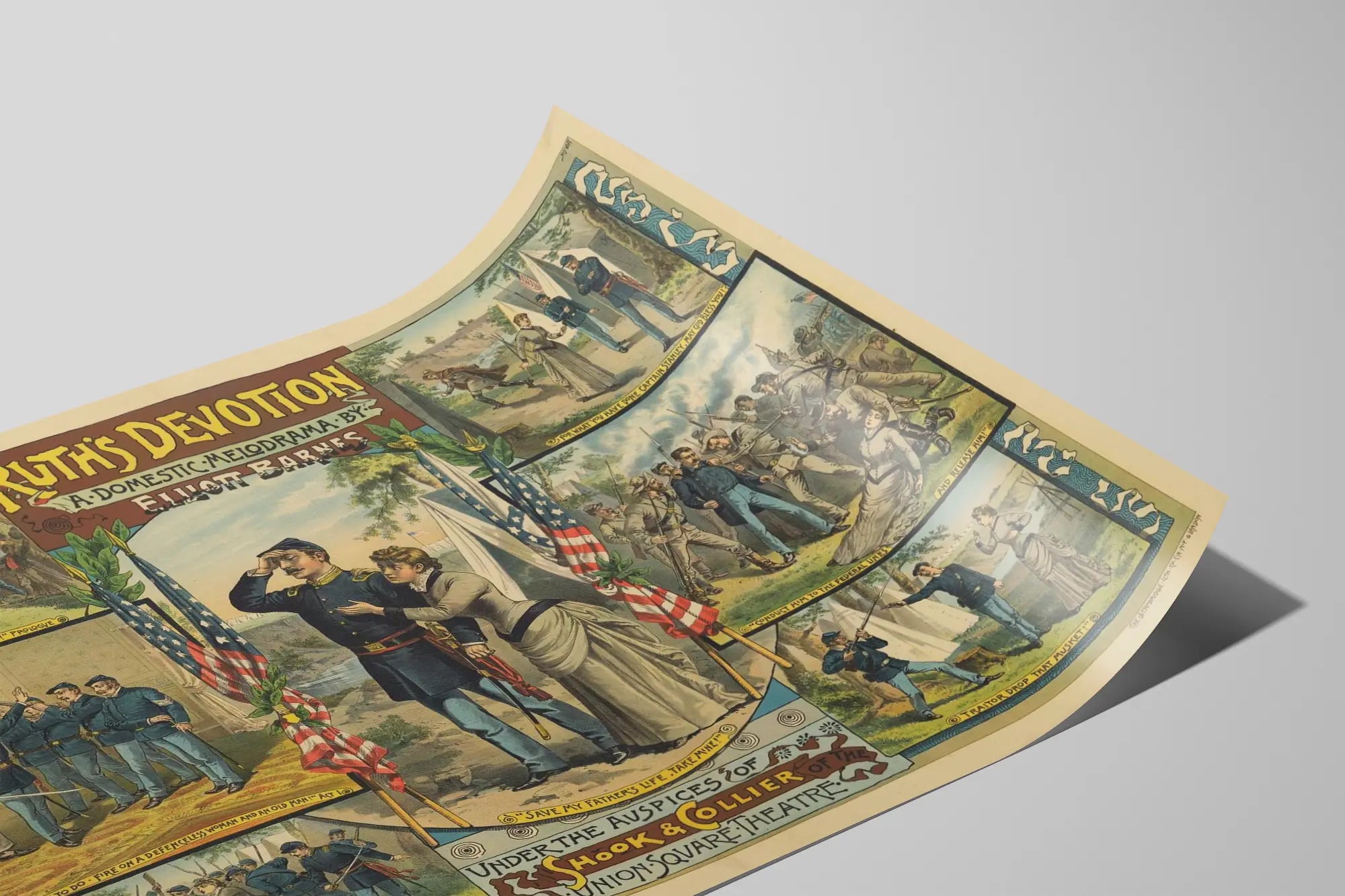 Deze vintage poster getiteld "Ruth's Devotion" is een boeiend decoratief stuk dat een huiselijk melodrama uitbeeldt, geschreven door Elliott Barnes. Perfect voor een originele wanddecoratie, toont deze poster een reeks dramatische en historische scènes geïllustreerd met een klassieke vertelstijl. In het midden staat een militair paar, omringd door twee Amerikaanse vlaggen, een krachtig symbool van toewijding en opoffering, een belangrijk thema van het melodrama. Rondom dit centrale beeld bevinden zich zes vensters die de hoofdscène omlijsten, elk illustrerend een belangrijk moment uit het verhaal met personages in militaire uniformen, gewapende bendes, en emotionele interacties tussen burgers en soldaten. De inscripties onder elk venster vervolledigen de leeservaring van de poster, met zinnen zoals "Red de levens van mijn vader, neem die van mij!" of "Moord me niet, Massa, ik ben onschuldig!", die de kijker onderdompelen in de dramatische intensiteit van het stuk. De typische kleuren van die tijd, zacht en licht vervaagd, geven een authentieke retro charme die liefhebbers van historische of vintage wanddecoratie zal bekoren. Deze poster is perfect om een muur te versieren in een woonkamer, kantoor of bibliotheek, en brengt een unieke artistieke en narratieve toets. Verkrijgbaar als poster, vormt het een mooi eerbetoon aan de podiumkunsten en het theater, terwijl het een evocatieve esthetiek biedt van de spanningen en huiselijke toewijding die verband houden met de militaire context. Verfraai je interieur met deze wanddecoratie die rijk is aan geschiedenis en visueel gevoel.
